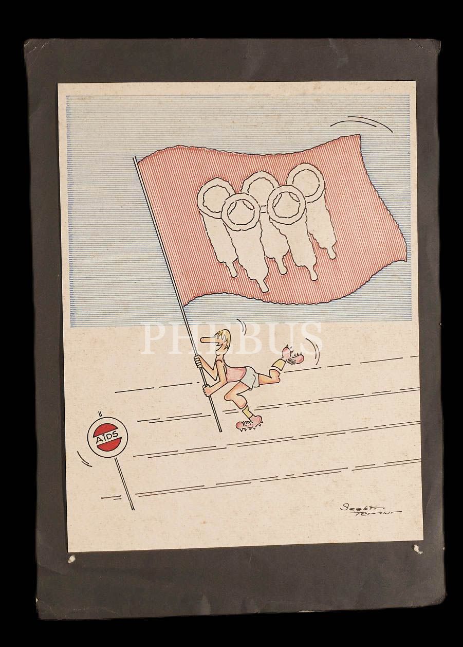 Seçkin Temur ıslak imzalı, AIDS konulu karikatür, kartona yapışık, 24x33 cm...