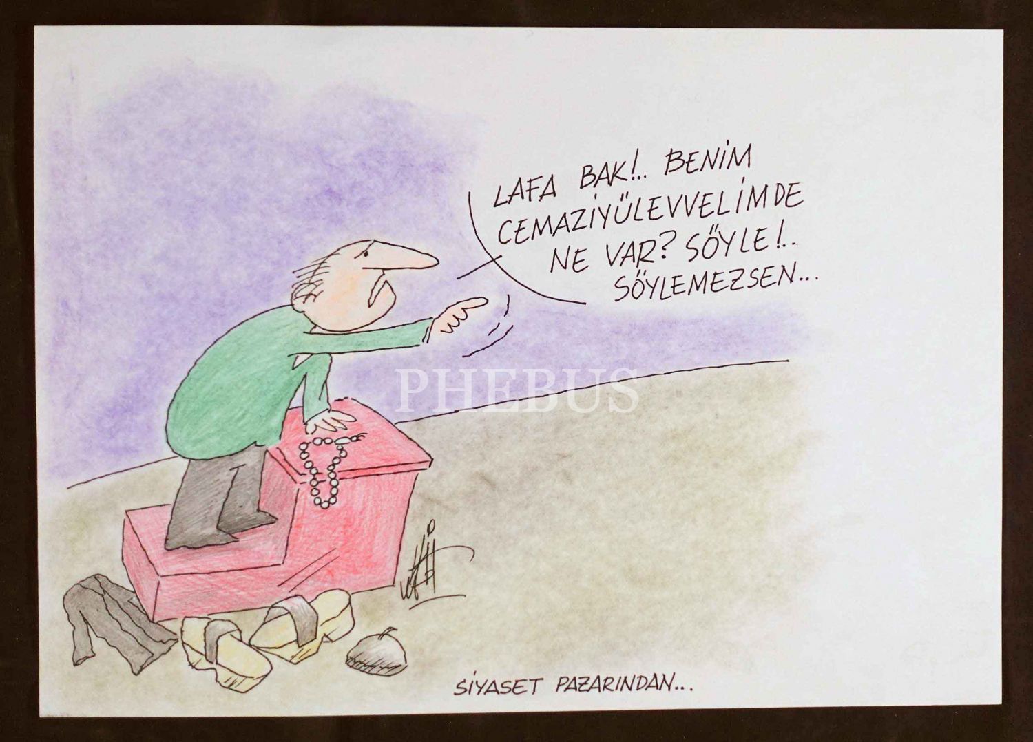 Hikmet Aksoy ıslak imzalı, "Siyaset Pazarından" başlıklı karikatür, 30x21 cm...