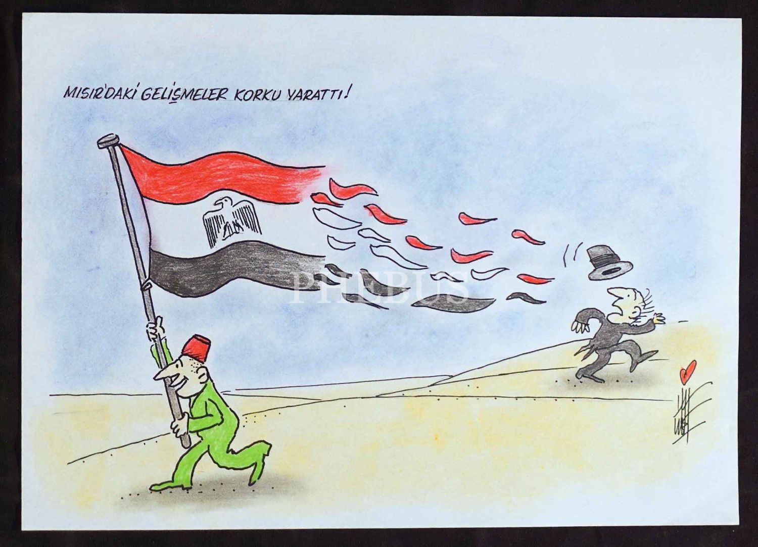 Hikmet Aksoy ıslak imzalı, "Mısır´daki Gelişmeler Korku Yarattı" başlıklı karikatür, 30x21 cm...
