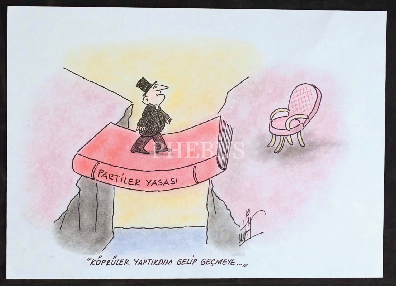 Hikmet Aksoy ıslak imzalı, Partiler Yasası konulu karikatür, 30x21 cm...