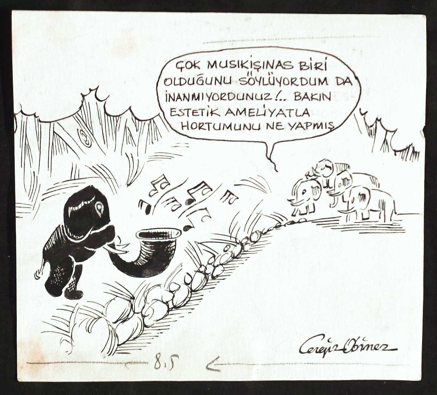 Cengiz Dönmez ıslak imzalı, filler ve müzik konulu karikatür, 16x14 cm...