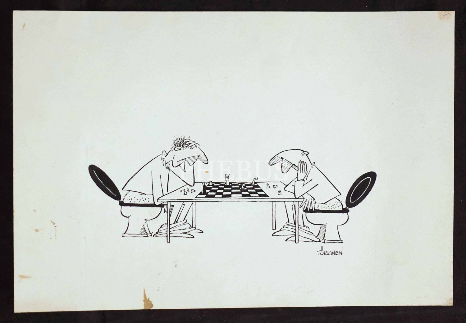 [Mehmet Ali] Türkmen ıslak imzalı, satranç konulu karikatür, 29x20 cm...