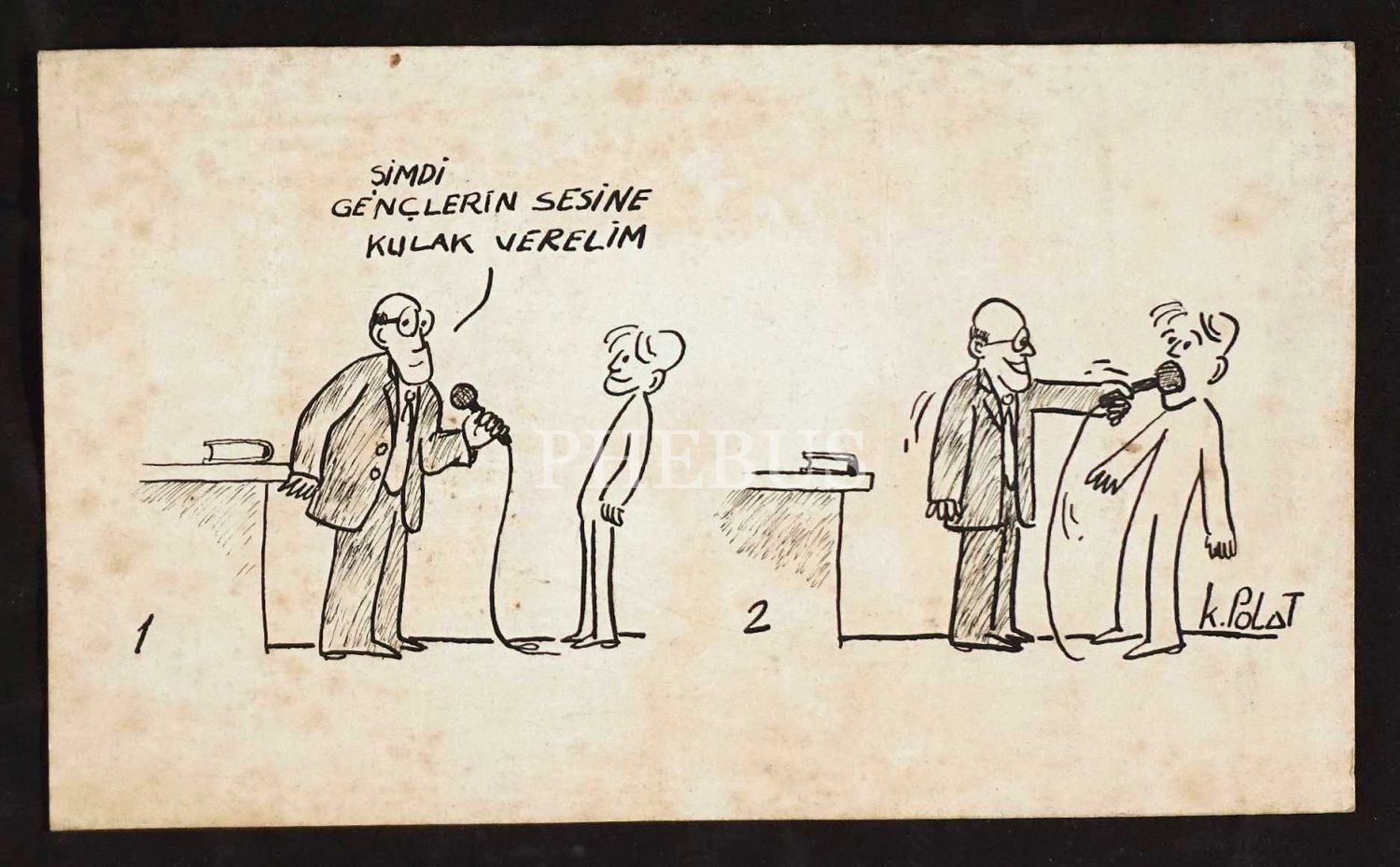 K. [Kazım] Polat ıslak imzalı, gençlerin sesi konulu karikatür, 20x12 cm...