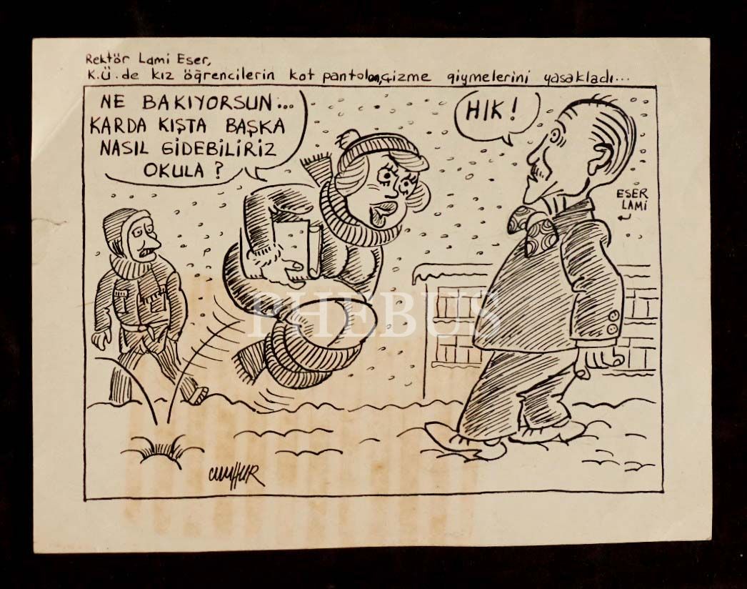 "Rektör Lami Eser, K.Ü.de kız öğrencilerin kot pantolon, çizme giymelerini yasakladı... +Ne bakıyorsun... Karda kışta başka nasıl gidebiliriz okula? -Hık!"
