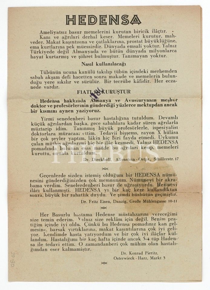 "Ameliyatsız basur memelerini kurutan biricik ilâçtır. Kanı ve ağrıları derhal keser. Memeleri kurutur, mahveder. Makat kaşıntısına ve çatlaklarına, prostat büyüklüğüne, ema kurtlarına pek müessirdir. Dünyada emsali yoktur. Yalnız Türkiyede değil Almanyada ve bütün dünyada milyonlarca hayat kurtarmış ve şöhret bulmuştur. Tanımayan yoktur."