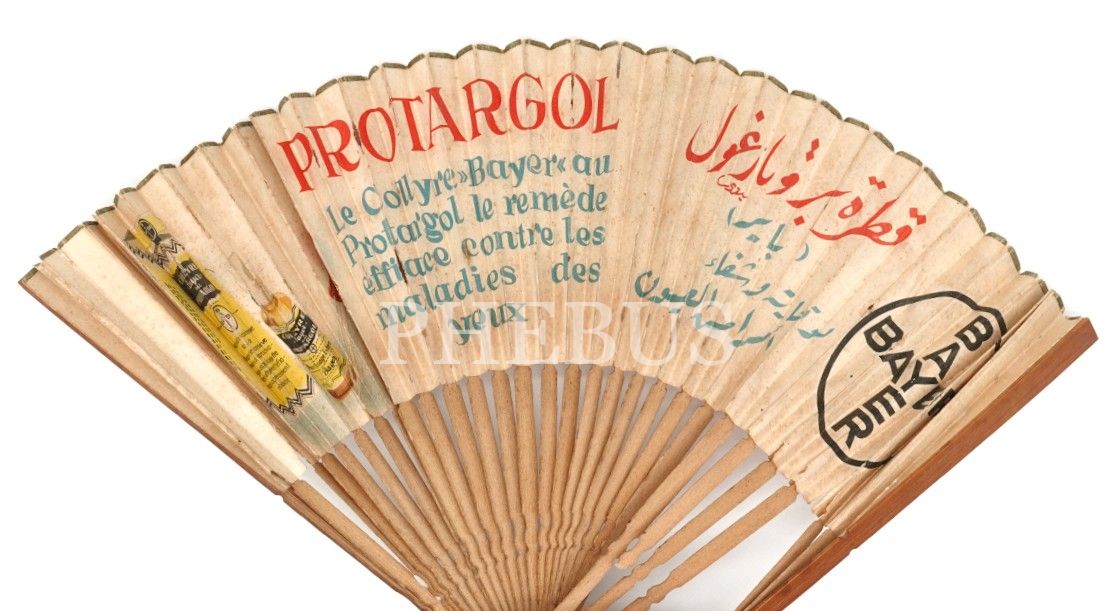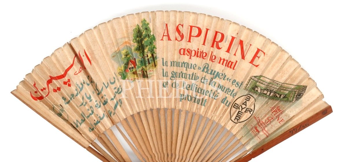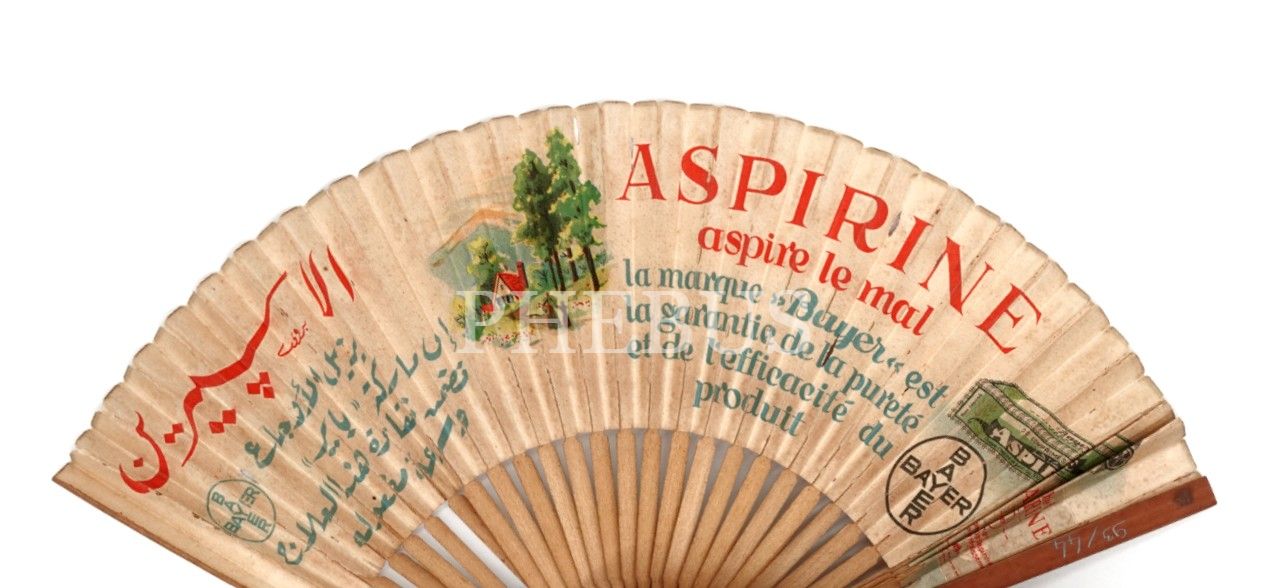 Arapça-Fransızca "BAYER ASPIRINE ve PROTARGOL" reklamlı yelpaze, 18x3 cm...