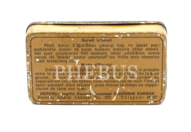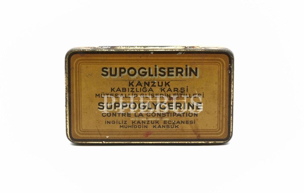 Türkçe-Fransızca "SUPOGLİSERİN (İngiliz Kanzuk Eczanesi - Muhiddin Kansuk)" kabız ilacı kutusu, 8x4 cm...