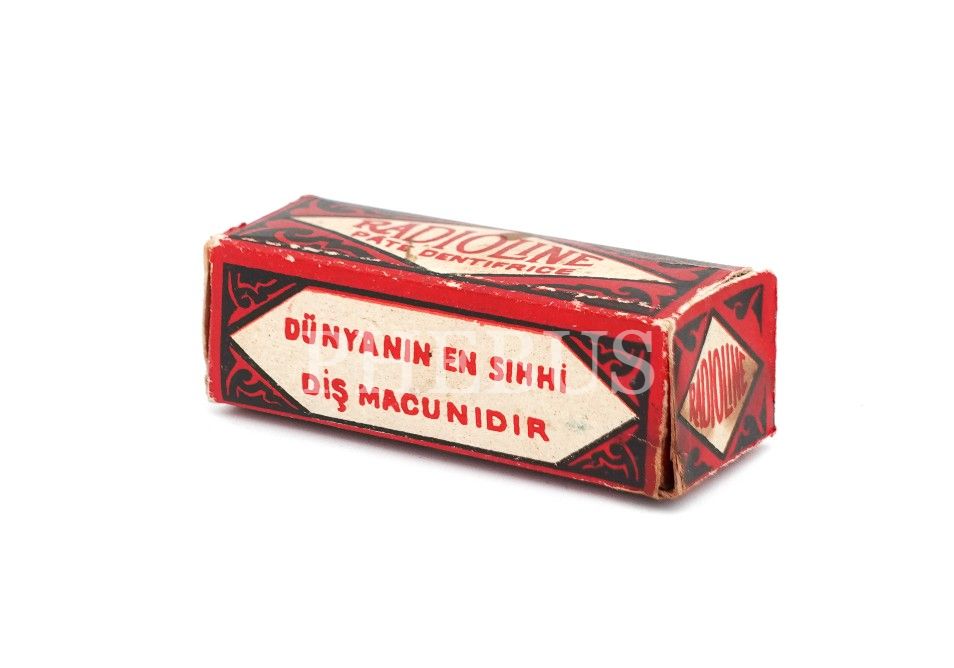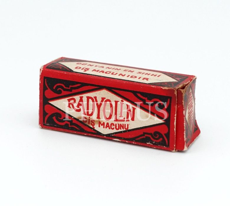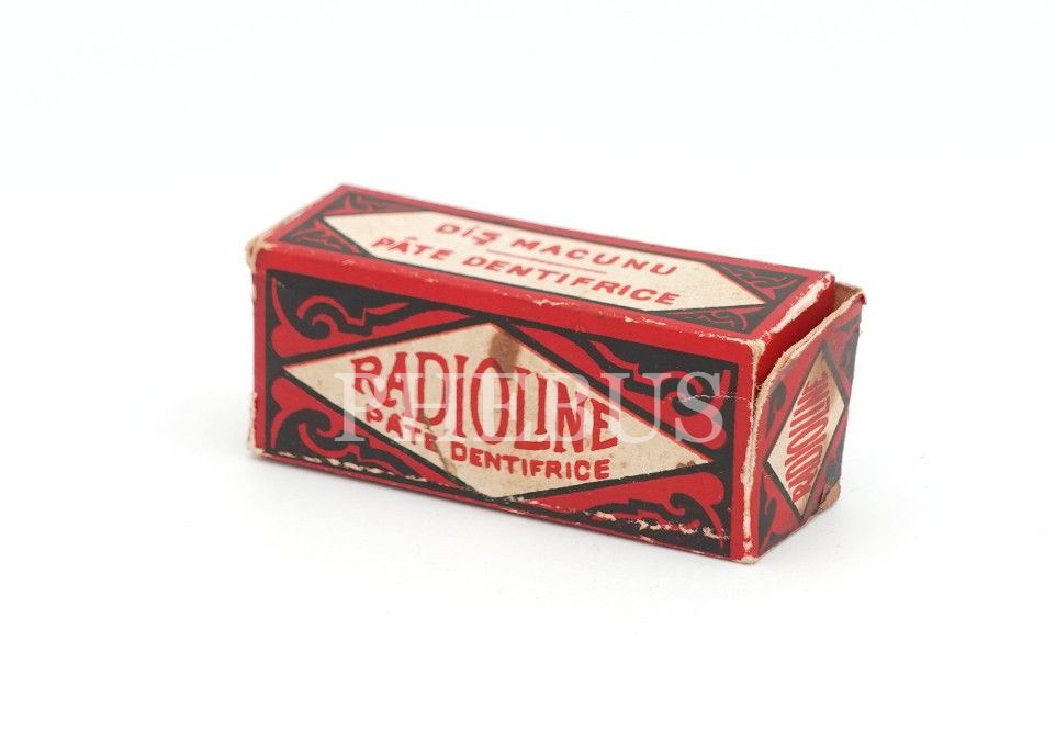 Türkçe-Fransızca "RADYOLİN DİŞ MACUNU" kutusu, boş, 6x2x2 cm...