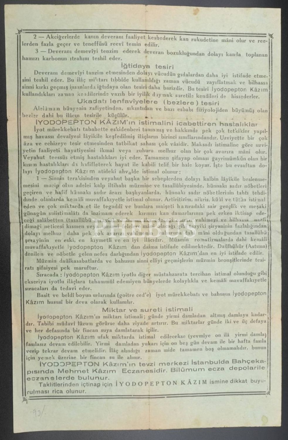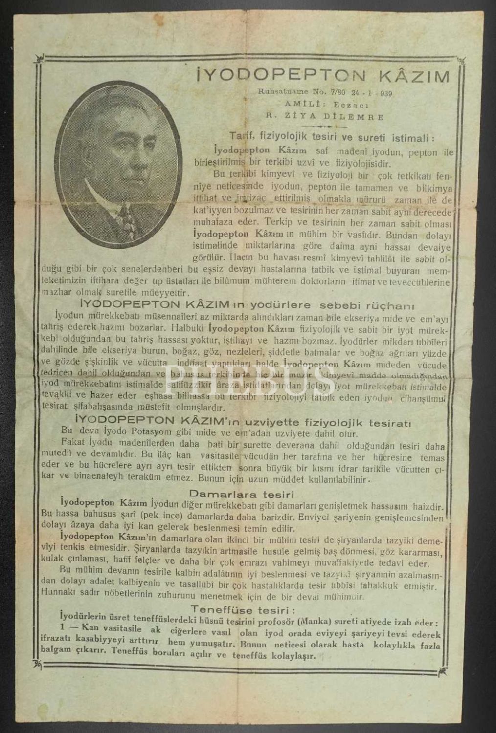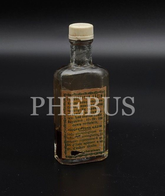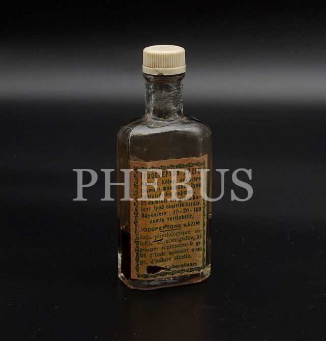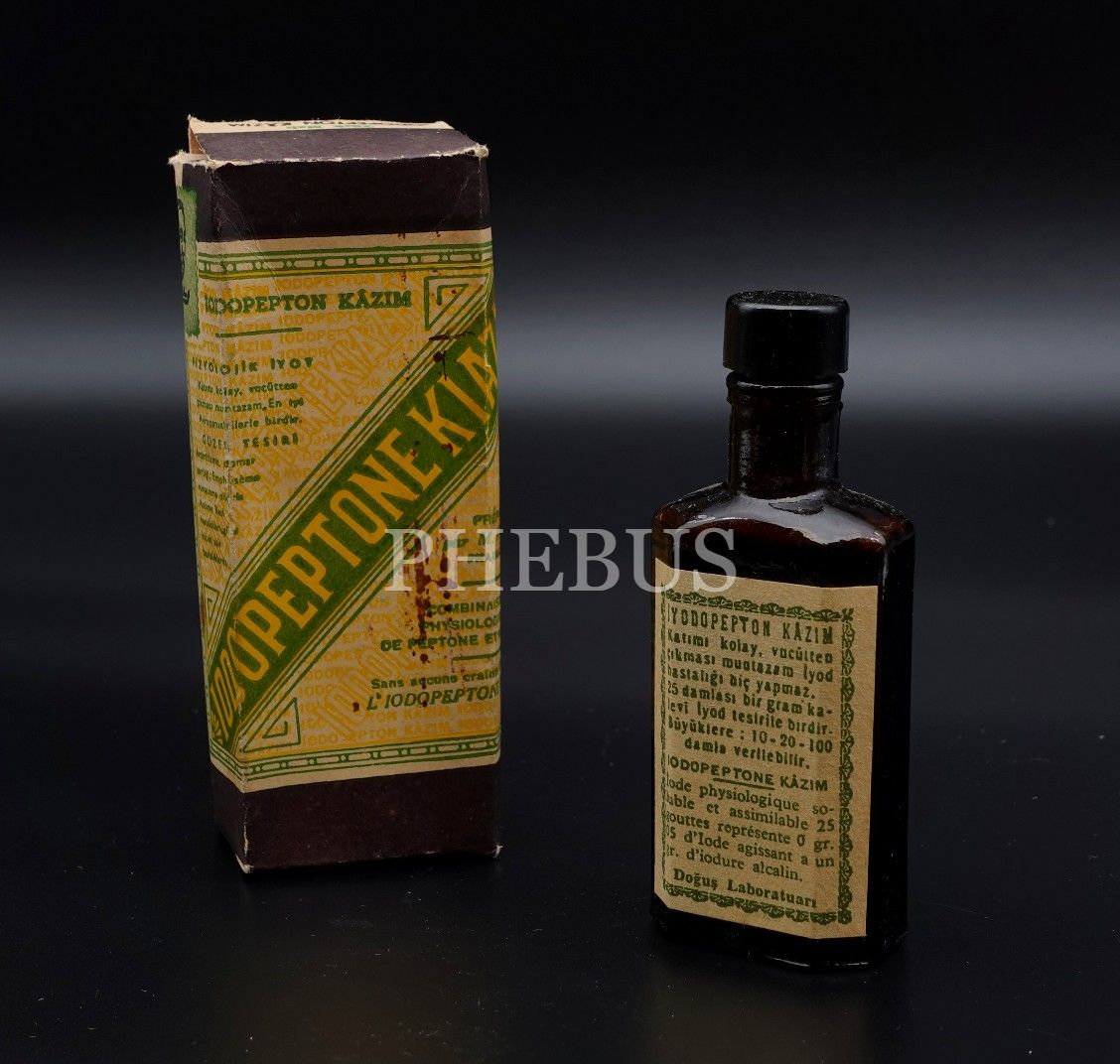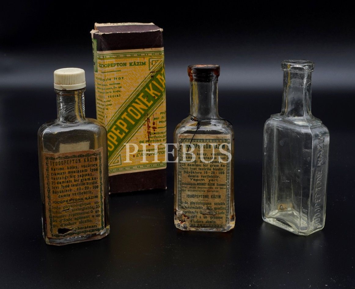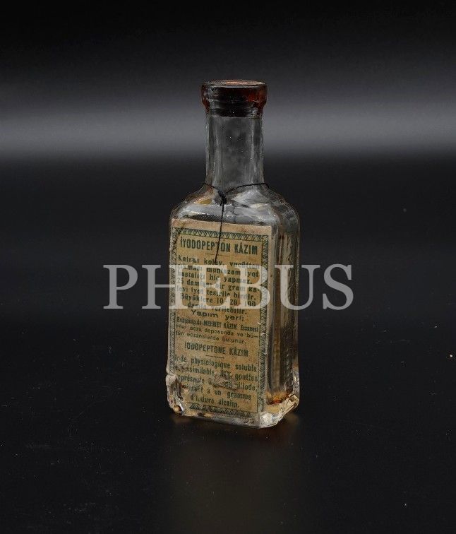 Lot içerisinde, İyodopepton Kâzım prospektüsü (1928 sonrası), "Jodopeptone Kiazim" yazılı boş şişe (1914-18), "İyodopepton Kâzım" etiketli boş şişe ("Bahçekapıda Mehmet Kâzım Eczanesi"), prospektüsün de yer aladığı orijinal kutusunda "Doğuş Laboratuarı" üretimi, dolu "İodopepton Kâzım" şişesi (1960´lar) ve yine Doğuş Laboratuarı üretimi 1/3 dolu "İyodopepton Kâzım" şişesi yer almaktadır.