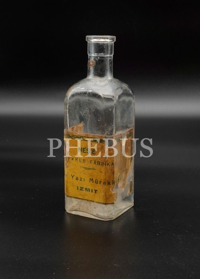 "NEŞ´E MÜREKKEB FABRİKASI (İzmit)" mamulatı "Sabit Yazı Mürekkebi" şişesi, boş, 17x5 cm...