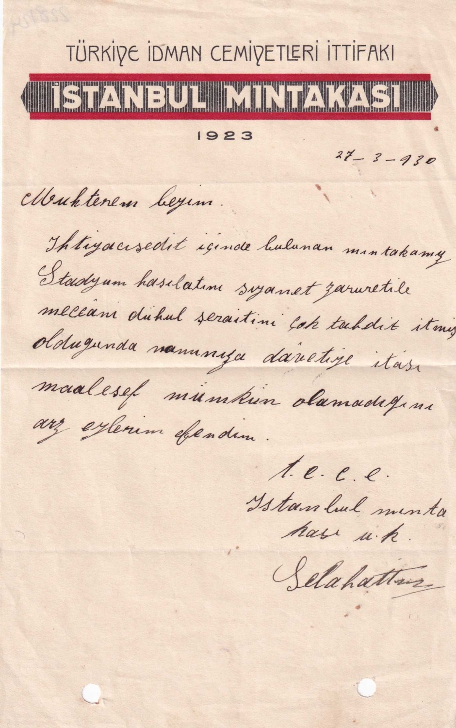 Türkiye İdman Cemiyeti İttifakı İstanbul Mıntıkası1923 antetli doküman, 13x21 cm