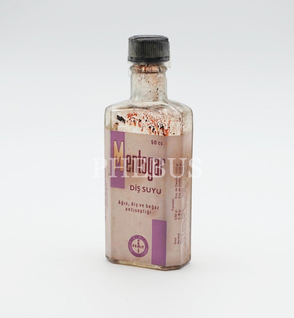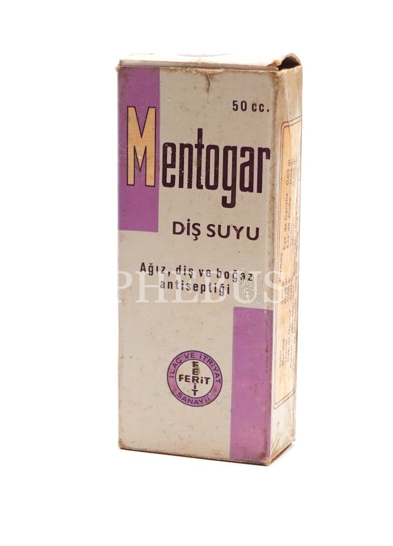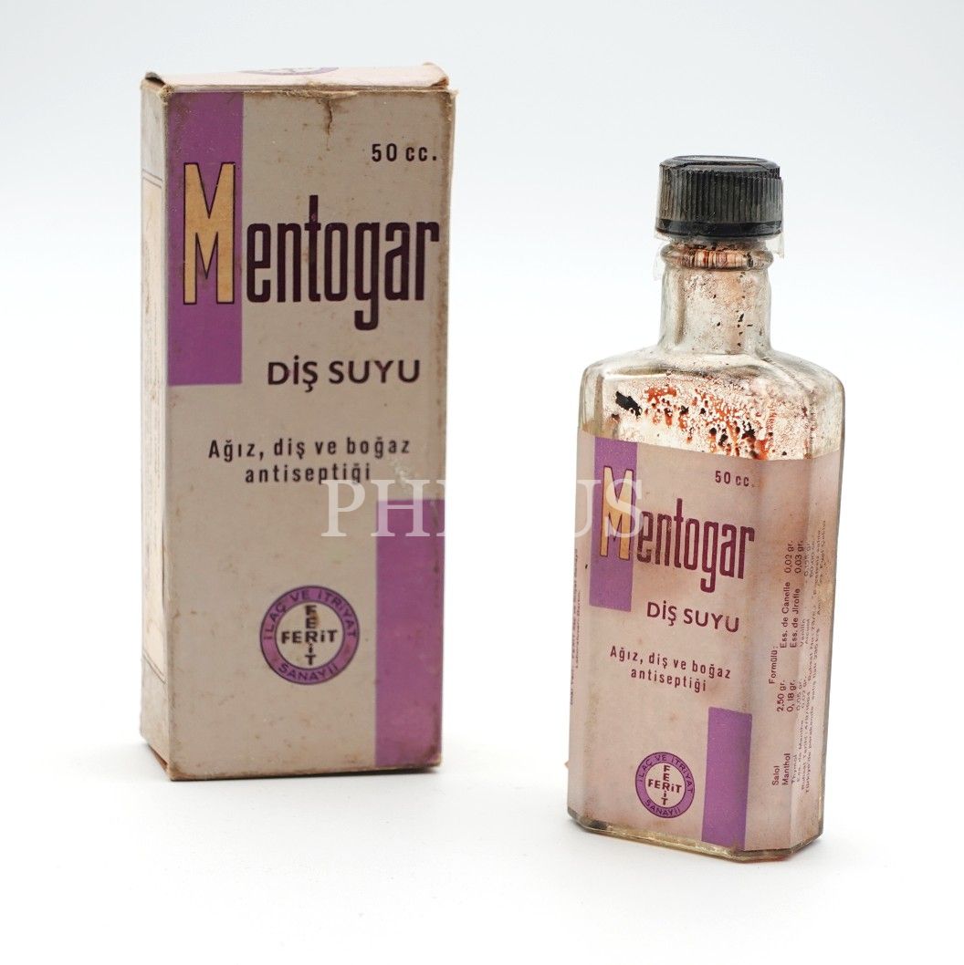 Orijinal kutusunda MENTOGAR DİŞ SUYU şişesi (boş), Ferit İlaç ve Itriyat Sanayii (Bartın), 12x5x3 cm...