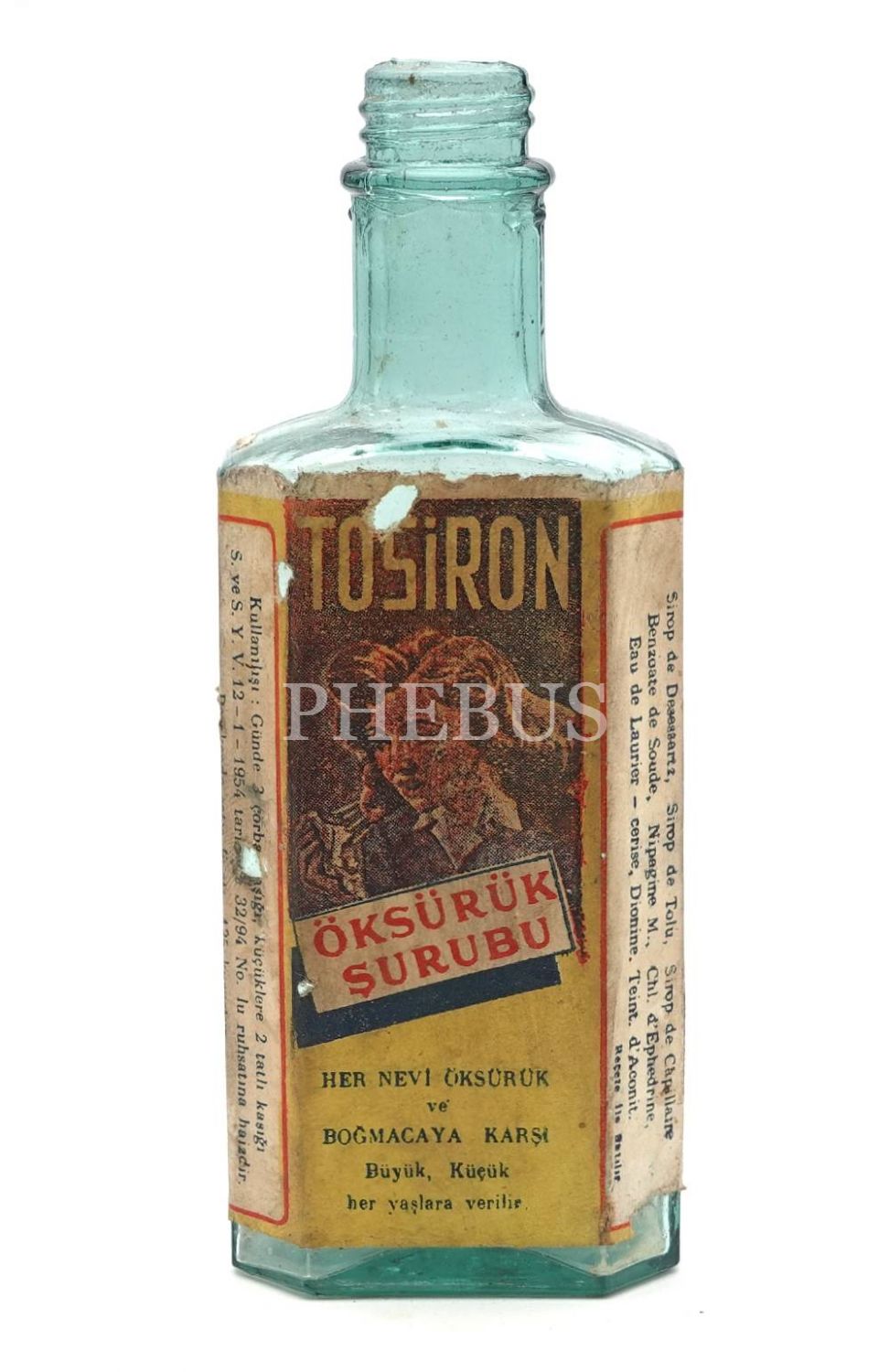 TOSİRON ÖKSÜRÜK ŞURUBU (A. Gabay) şişesi (boş), 1954 ruhsatlı, Zafer Müstahzarlar Laboratuarı (İstanbul), 15x5x3 cm...