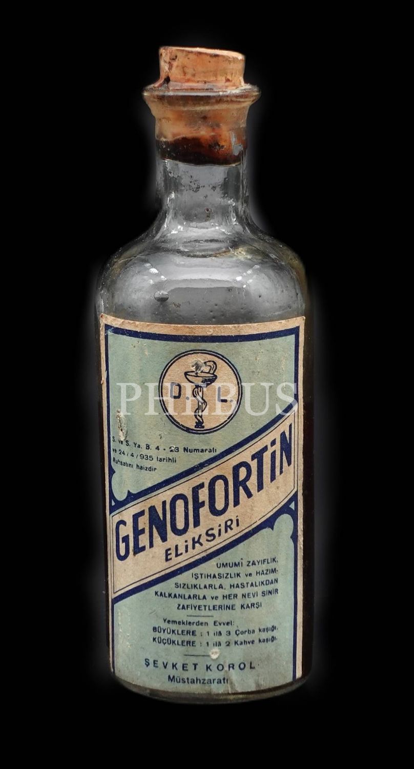 GENOFORTİN ELİKSİRİ (Şevket Korol) şişesi (yarısı dolu), 1935 ruhsatlı, Şevket Karol Müstahzaratı, 12x4 cm...