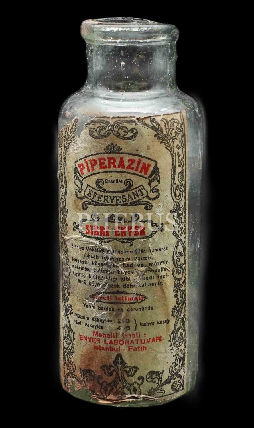 PİPERAZİN "Efervesant" şişesi (boş), mahalli imali: Enver Laboratuvarı (Sırrı Enver) - Fatih / İstanbul, 13x5 cm...