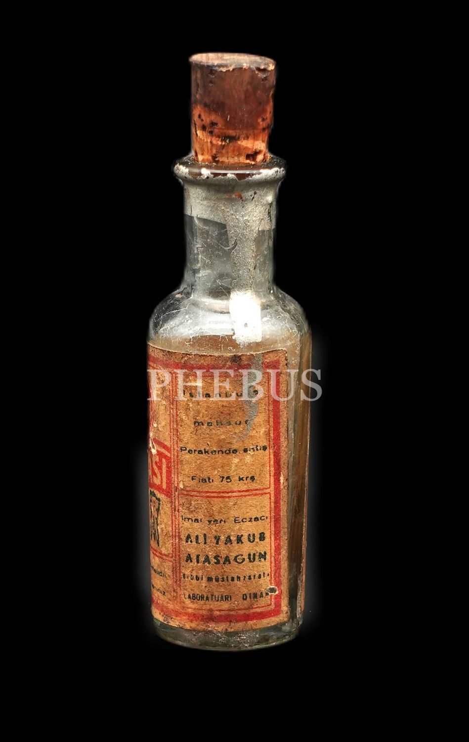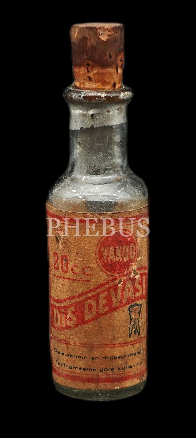 YAKUB DİŞ DEVASI şişesi (boş), imal yeri: Eczacı Ali Yakub Atasagun Tıbbî Müstahzaratı (1934), 10x3 cm...
