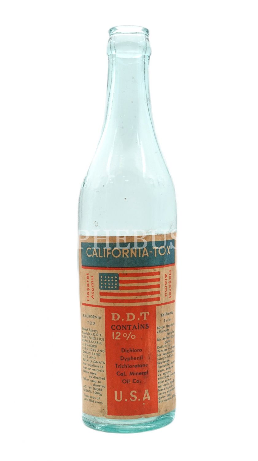 İNHİSARLAR kabartma yazılı ve CALIFORNIA-TOX (Haşarat Atomu) etiketli, Amerikan malı böcek ilacı şişesi (boş), 24x6 cm...