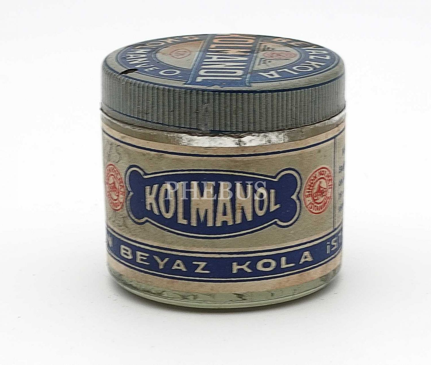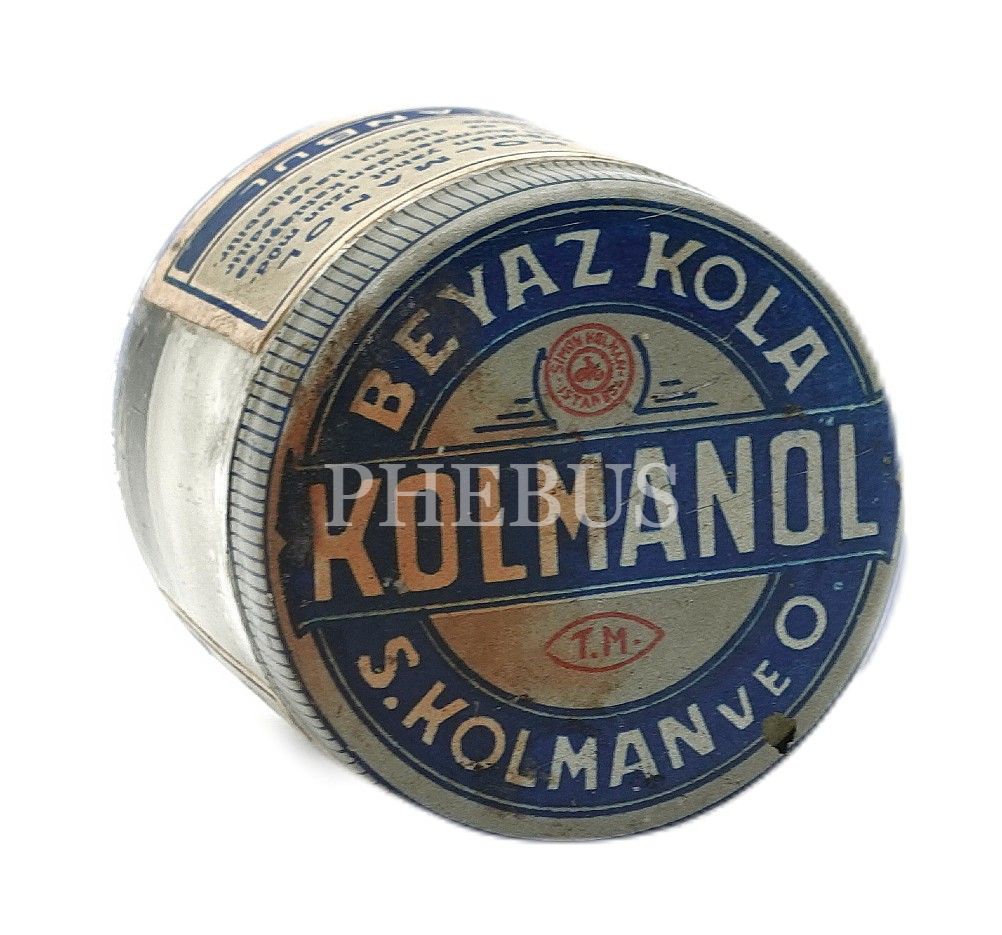 KOLMANOL kabartma yazılı, etiketli ve kapaklı S. KOLMAN BEYAZ KOLA kavanozu (boş), Simon Kolman (İstanbul), 5x5 cm...