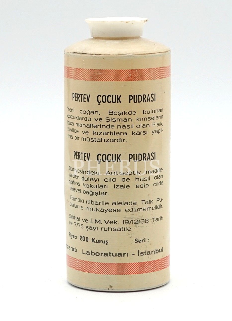 "Pertev Çocuk Pudrası, yeni doğan, beşikde bulunan çocuklarda ve şişman kimselerin bazı mahallerinde hasıl olan pişik, sivilce ve kızartılara karşı yapılmış bir müstahzardır."