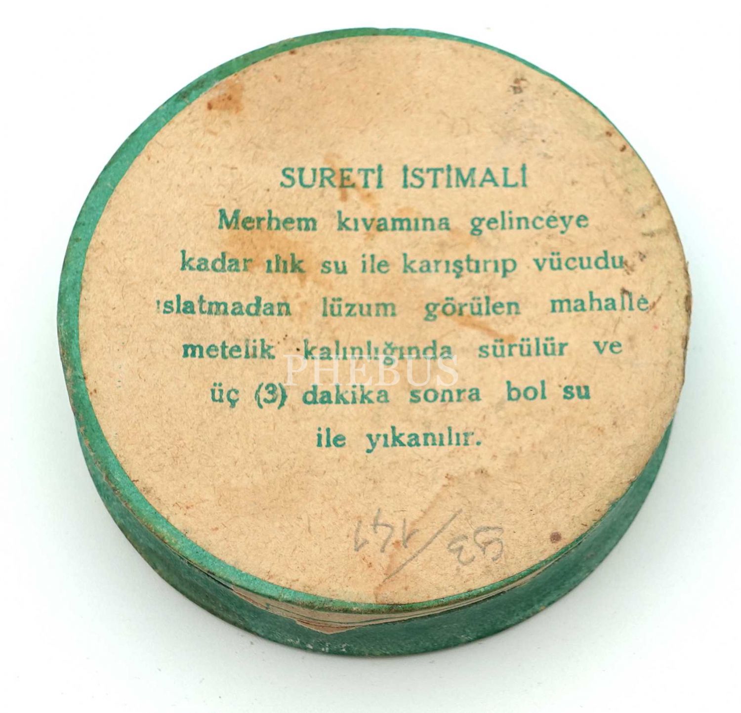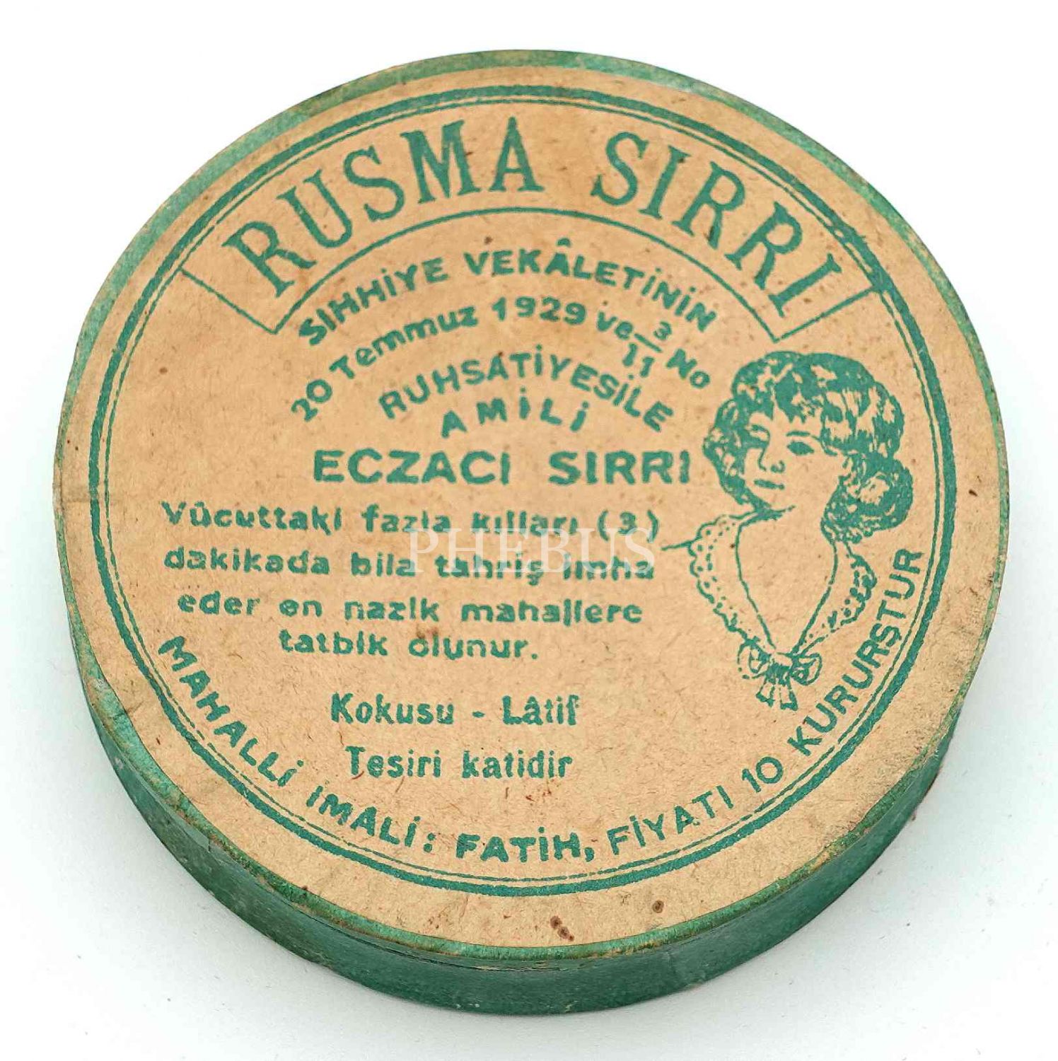 "Vücuttaki fazla kılları 3 dakikada bila tahriş imha eder, en nazik mahallere tatbik olunur. Kokusu lâtif, tesiri katidir."
