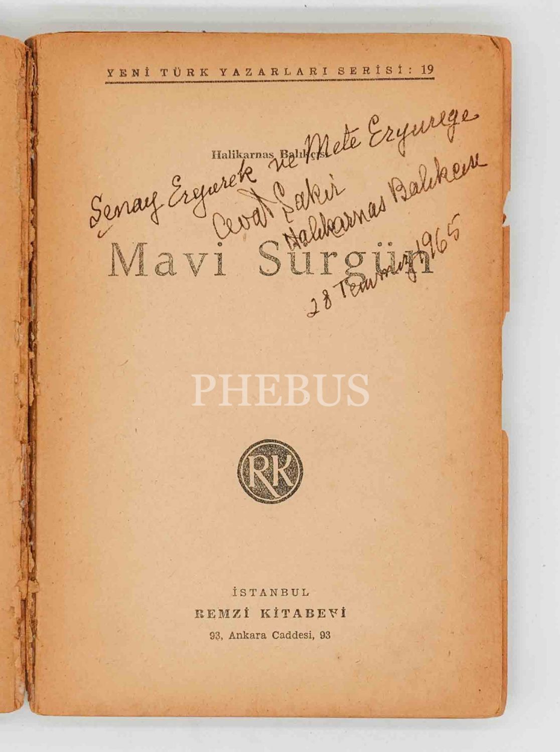 "Halikarnas Balıkçısı" namıyla tanınan Cevat Şakir Kabaağaçlı´nın kendi adı ve mahlasıyla imzaladığı romanının birinci baskısı... İthaf, "Şener Ertürek ve Mete Eryürge. 28 Temmuz 1965" şeklindedir. *Bazı sayfalar ciltten ayrılmıştır ve cildi yorgundur.