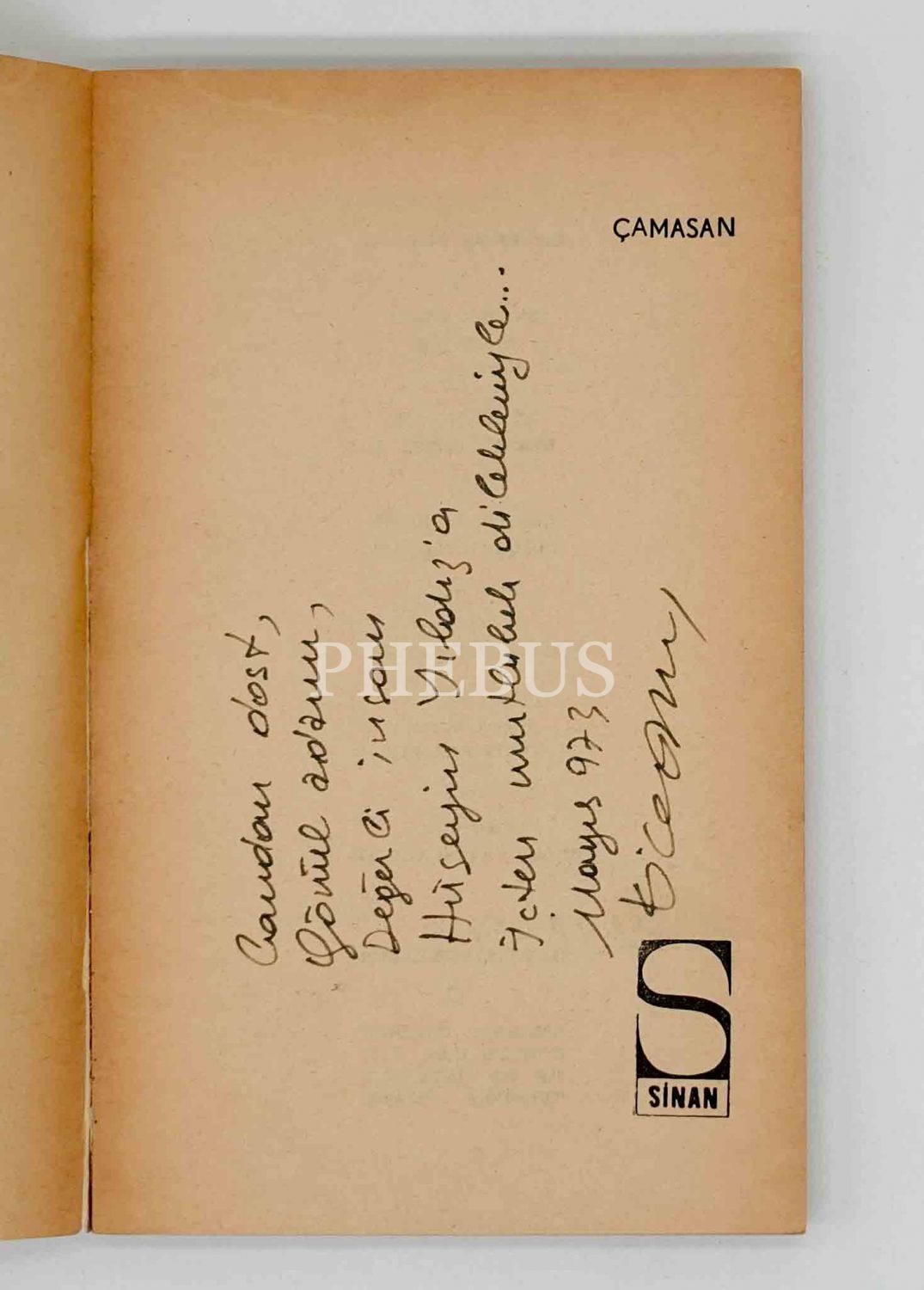 İthaf, "Candan dost, gönül adamı, Değerli insan Hüseyin Yıldız´a içten mutluluk dilekleriyle... Mayıs 973" şeklindedir.