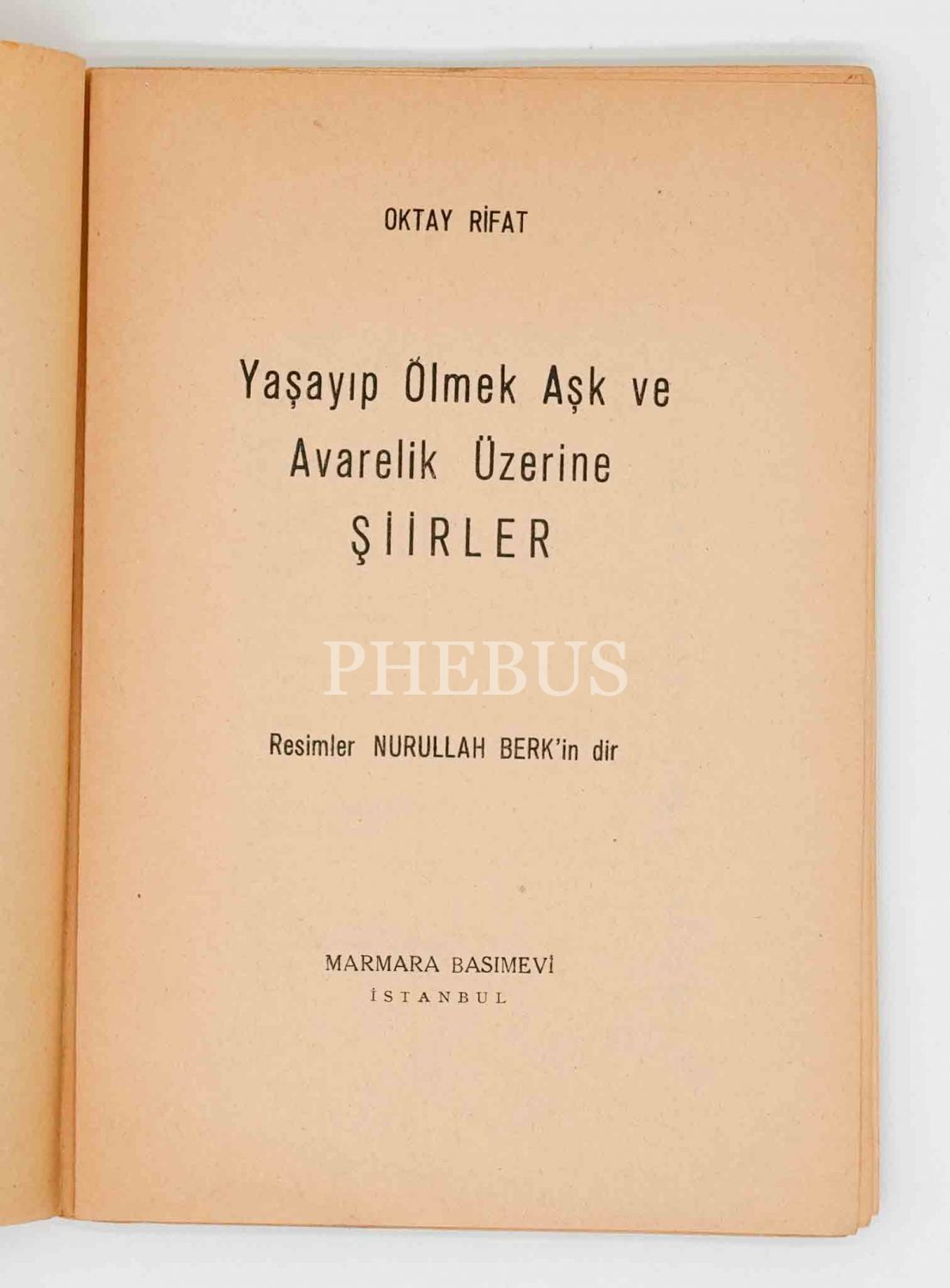 İlk baskısı Nebioğlu Yayınevi'nden yapılan ama özensizliğiyle şairi hayal kırıklığına uğratan ve bu yüzden de dağıtıma girmeyen kitabın, kapak tasarımını hattat ve mücellit Emin Barın´ın, çizimlerini Nurullah Berk´in yaptığı ilk baskısı...*Bazı sayfalar sırttan ayrılmıştır.