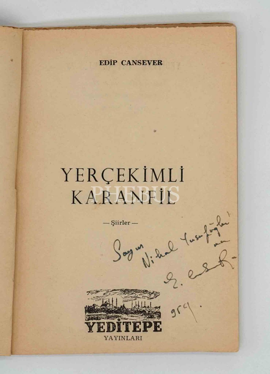 Orhan Peker´in kapak kompozisyonuyla, Edip Cansever´in üçüncü şiir kitabı... İthaf, "Sayın Nihal Yusufoğlu´na, E. Cansever, 959" şeklindedir.