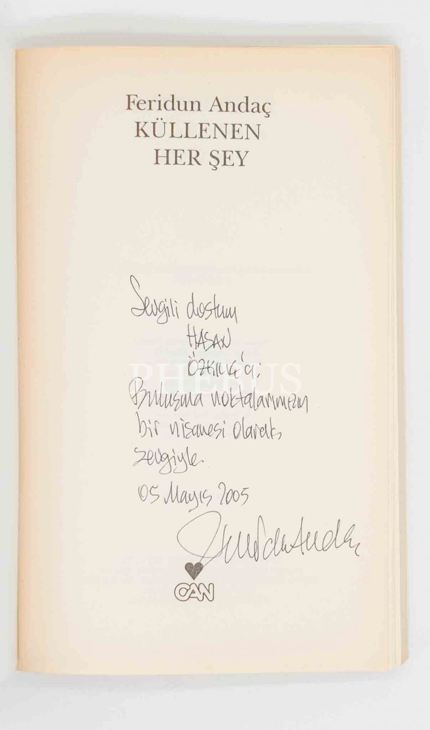 İthaf, "Sevgili dostum Hasan Özkılıç´a; Buluşma noktalarımızın bir nişanesi olarak sevgiyle. 05 Mayıs 2005, Feridun Andaç" şeklindedir.