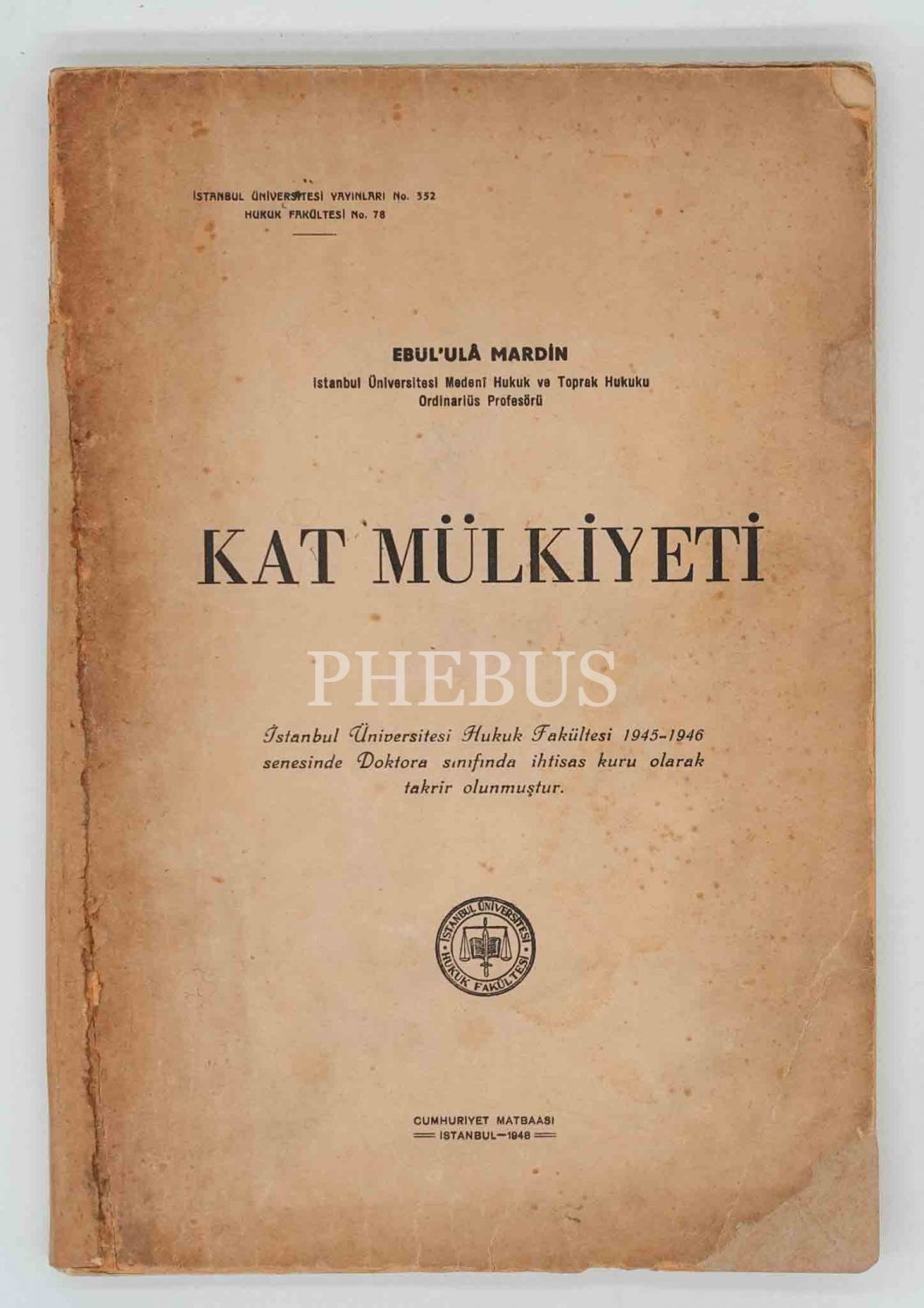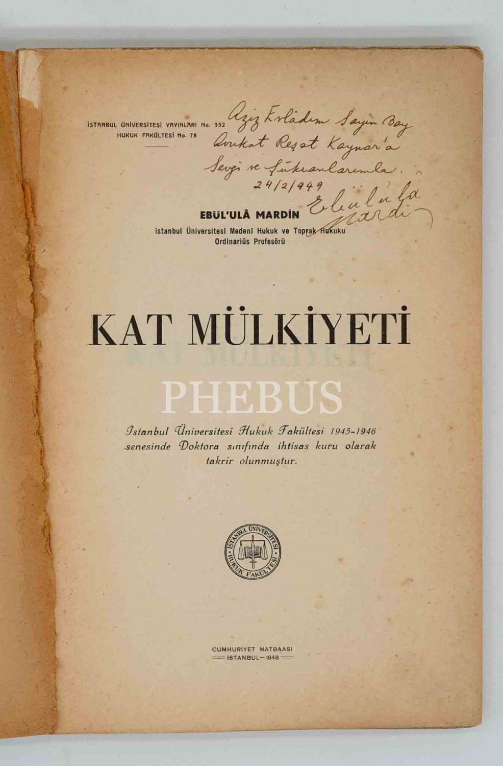 KAT MÜLKİYETİ, Ebül´ulâ Mardin, 1948, İstanbul Üniversitesi yayınları, 198 sayfa, 17x25 cm...