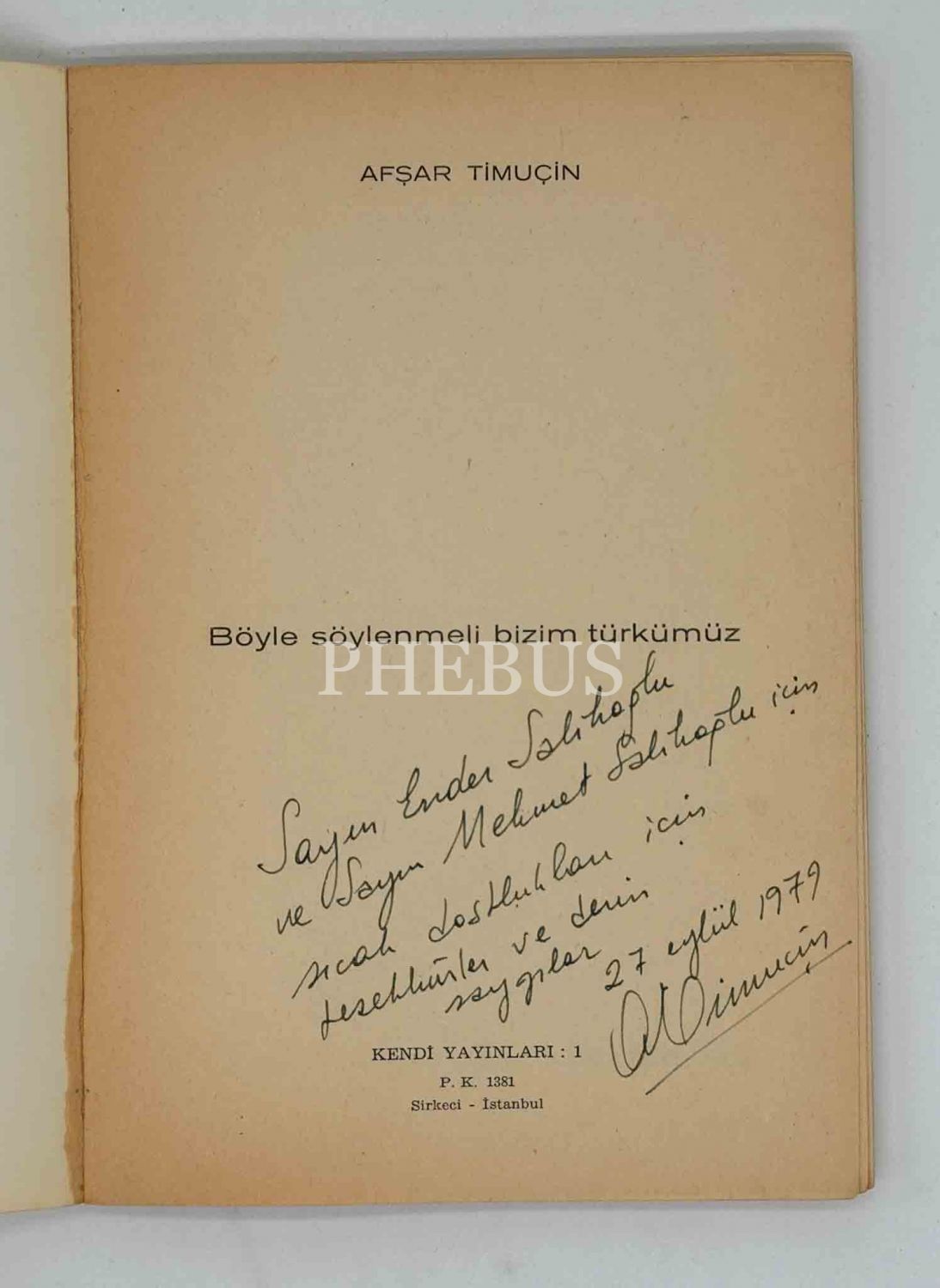 İthaf, "Sayın Ender Salihoğlu ve Sayın Mehmet Salihoğlu için sıcak dostlukları için teşekkürler ve derin saygılar. 27 Eylül 1979, A. Timuçun" şeklindedir. Bazı satırlar işaretlenmiş, altları çizilmiştir.