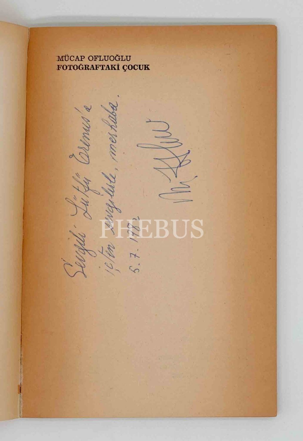 Tiyatro oyuncusu ve şair Mücap Ofluoğlu´nun yayımlanan ilk şiir kitabı... İthaf, "Sevgili Lütfü ...´a içten sevgilerle, merhaba. 5.7.1982, M. Ofluoğlu" şeklindedir.