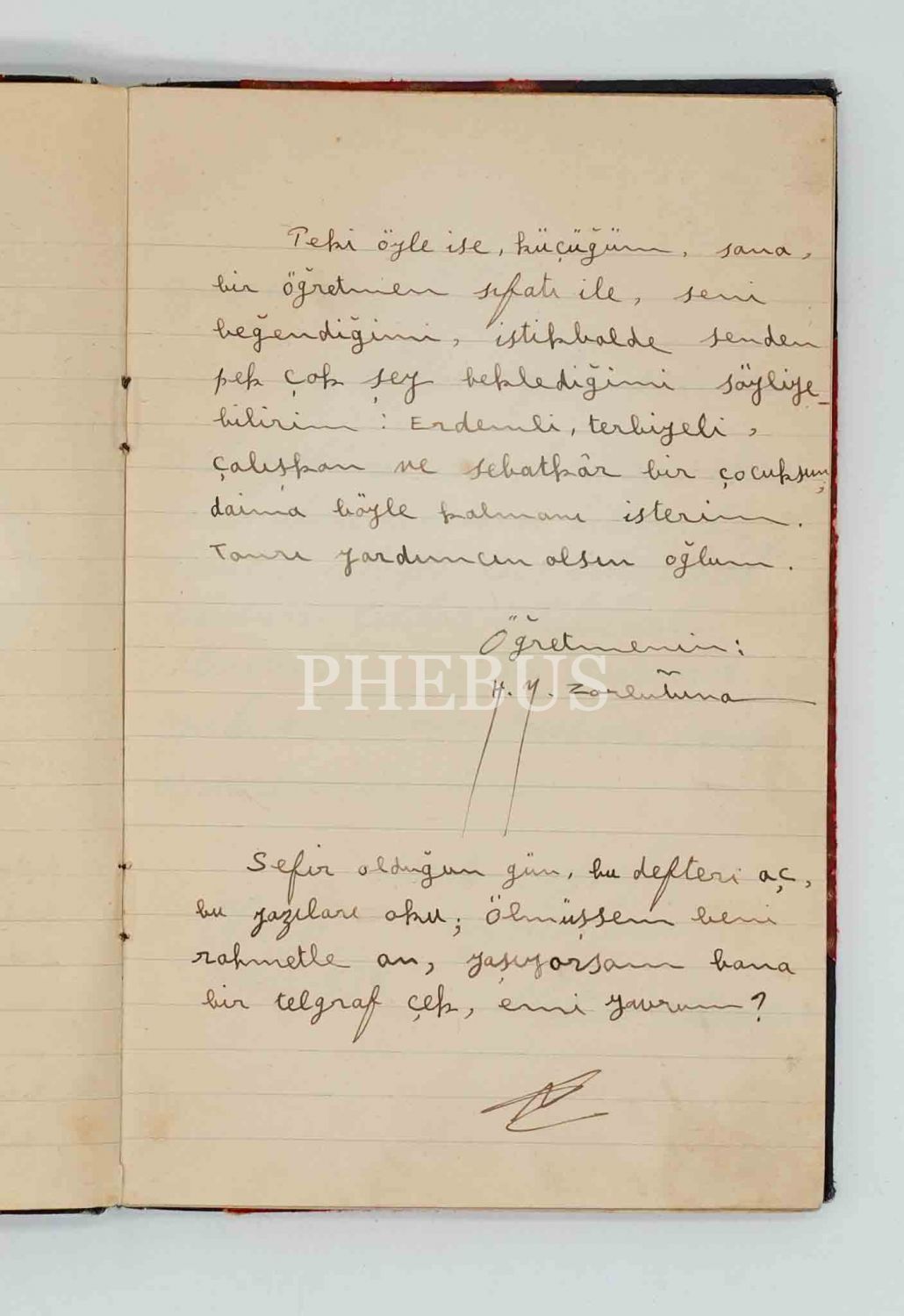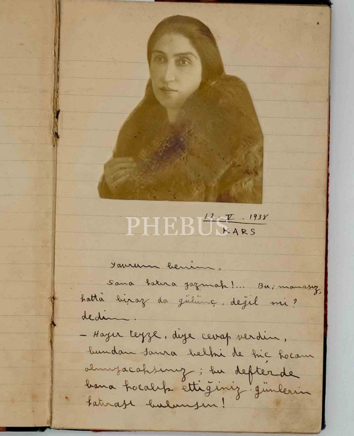 Karslı bir öğrencinin, "Kadın yazarların annesi" olarak tanınan öğretmeni Halide Nusret Zorlutuna´nın veda yazısını ve fotoğrafını da içeren, 1938 tarihli hatıra defteri, 13x20 cm...