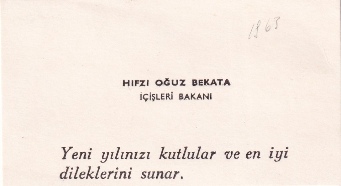 İçişleri Bakanı Hıfzı Oğuz Bekata'ya ait kartvizit, 9x5 cm