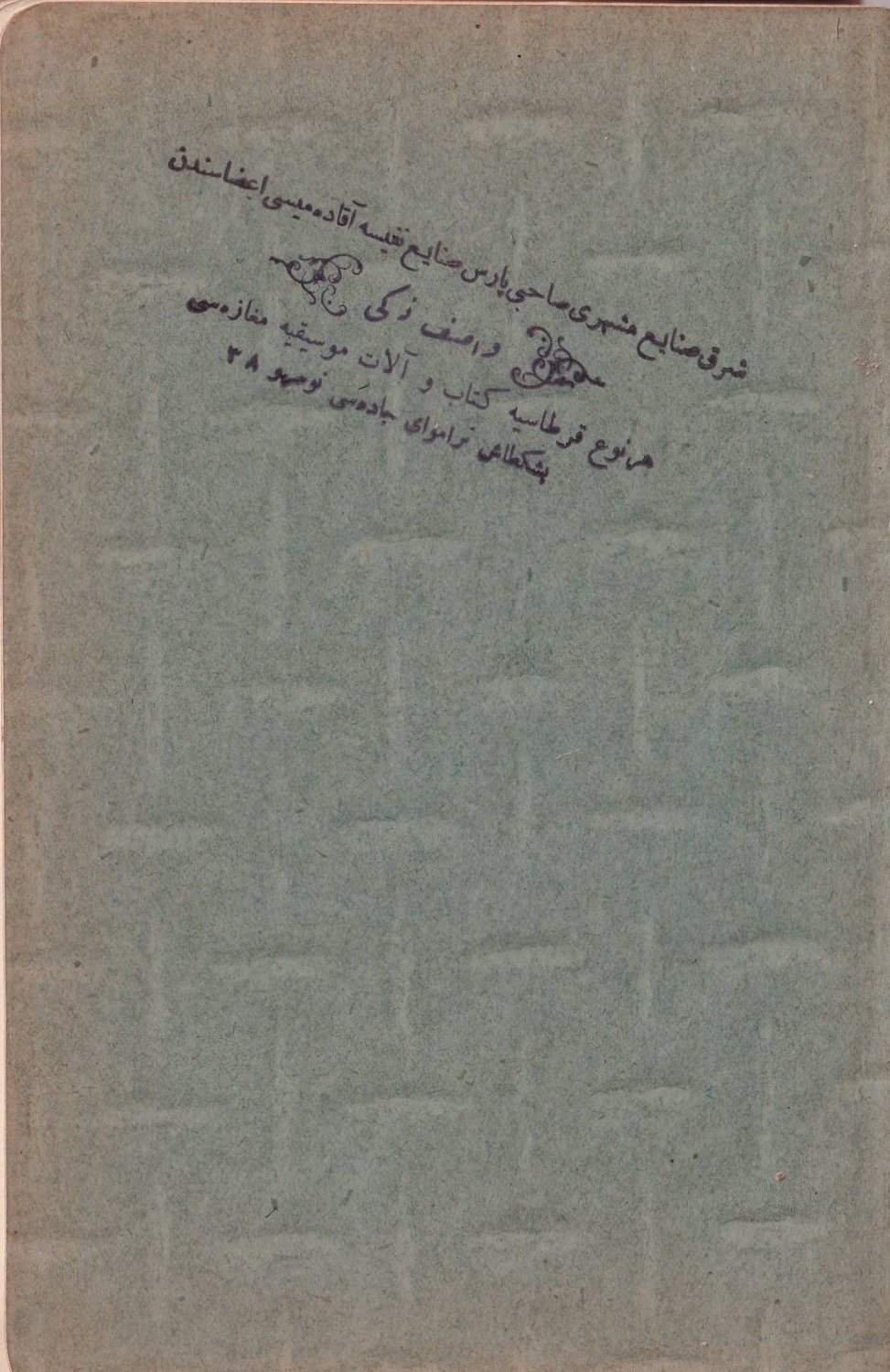 arka sayfada Osmanlıca 'Şark Sanayi Mütesehhir Sahibi Paris Sanayi-i Nefise Akademisi Azasından Vasıf Zeki - Her nevi kırtasiye kitap ve alet-i musikiyye mağazası, Beşiktaş' damgası var