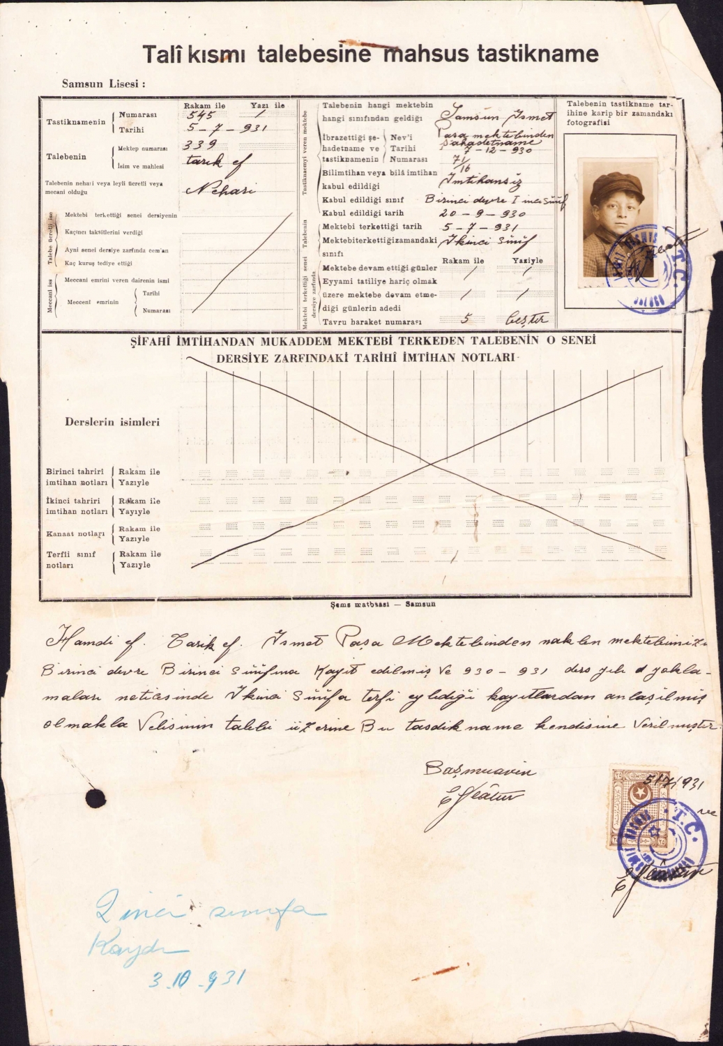 Samsun İsmet Paşa Mektebi tastikname, 1931, 27x41 cm