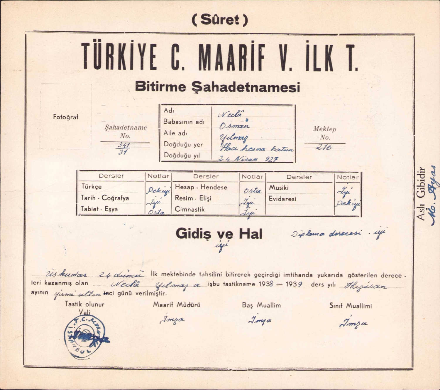 Türkiye Cumhuriyeti Maarif Vekaleti Üsküdar 24. İlk Mektep bitirme şehadetnamesi, 24x21 cm