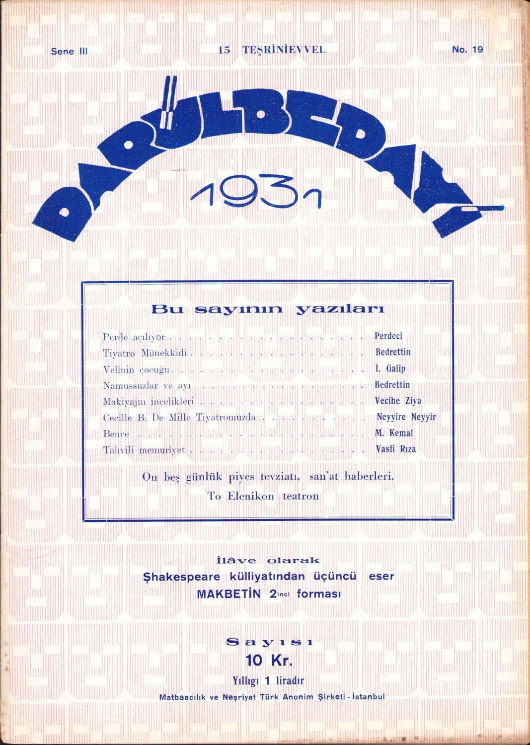 Darülbedayi mecmuası, 1931, resimli, 16 sayfa, 20x28 cm.