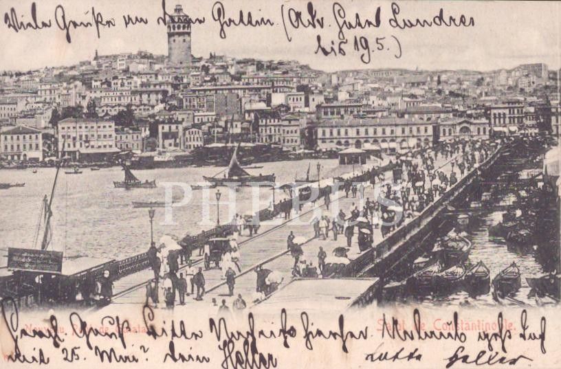 Galata Köprüsü ve Galata Kulesi, "Constantinople, Pont de Galata", pullu ve postadan geçmiş, İstanbul, 14x9 cm...
