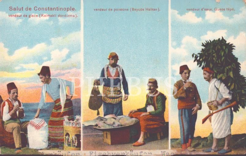 Osmanlı döneminden seyyar dondurmacı ve balıkçı ve sucu, "Salut de Constantinople, Vendeur de glace (kaimakli dondurma, vendeur de poissons ( Beycos Halkan), vendeur d´eaux, Gueos tepe", İstanbul, 14x9 cm...