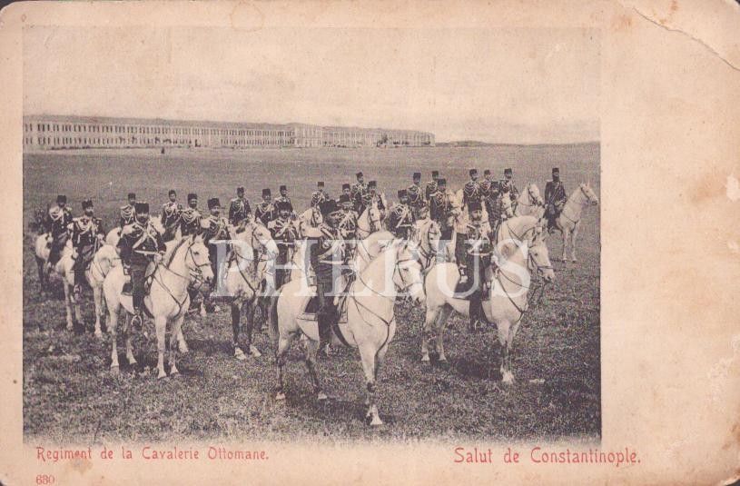 Selimiye Kışlası önünde Osmanlı Süvarileri, "Regiment de la Cavaliere Ottomane", İstanbul, 14x9 cm...