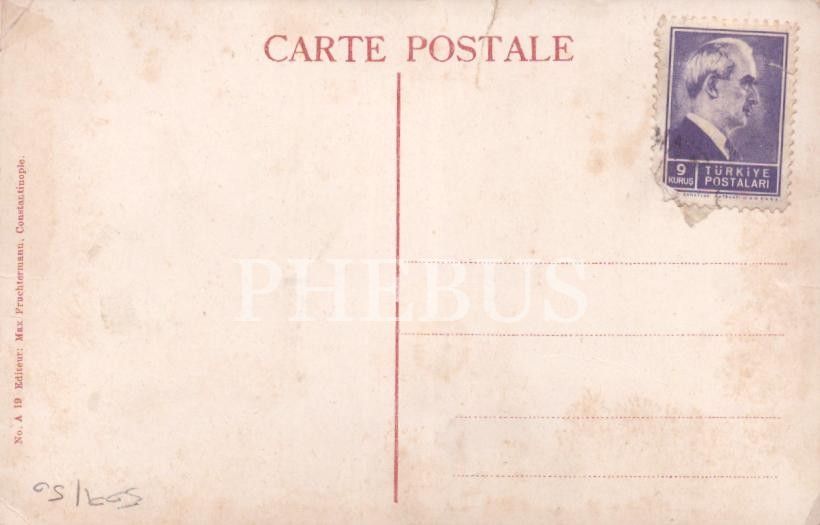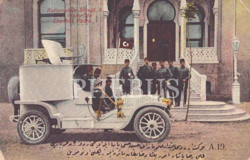 "Hareket Ordusu Payidar-ı Kumandanı Hüseyin Hüsnü Paşa ile Üçüncü Ordu Erkan-ı Harbiye Reisi Ali Rıza Paşa, Enver Bey ve zabıtan-ı saire ile zırhlı otomobil", "Automobile blinde & Etat major de Chefket Pacha", ed.: Max Fruchtermann, İstanbul, 14x9 cm...