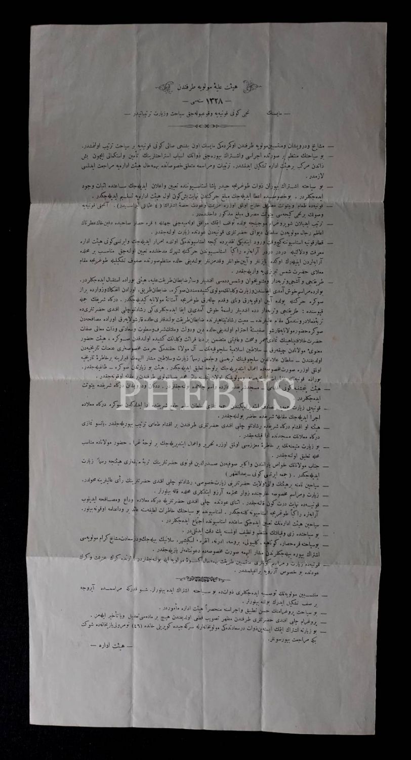 Heyet-i Aliyye-i Mevleviye tarafından 1328 senesi Mayıs ayında düzenlenecek Konya ziyaretinin Osmanlıca tertipnamesi, 25x50 cm...