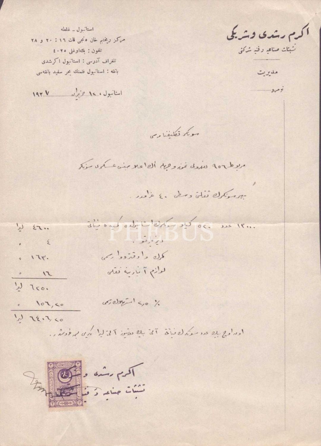 Ekrem Rüştü ve Şeriki Teşebbüs Sanayi ve Fenniye Şirketi antetli, Osmanlıca sünger satış teklifnamesi, 20x29 cm...