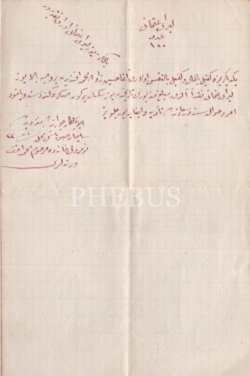 Yeğenine kefil olan beyefedinin 100 Osmanlı lirası borcunun senedi, 21x27 cm...