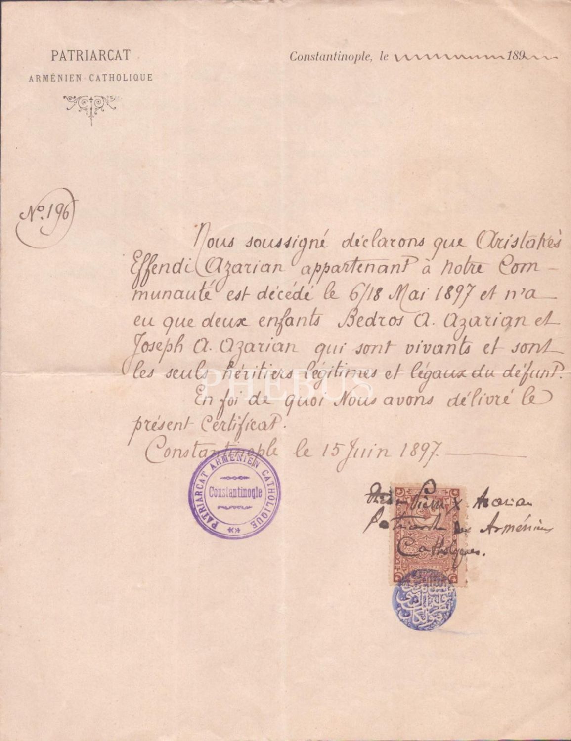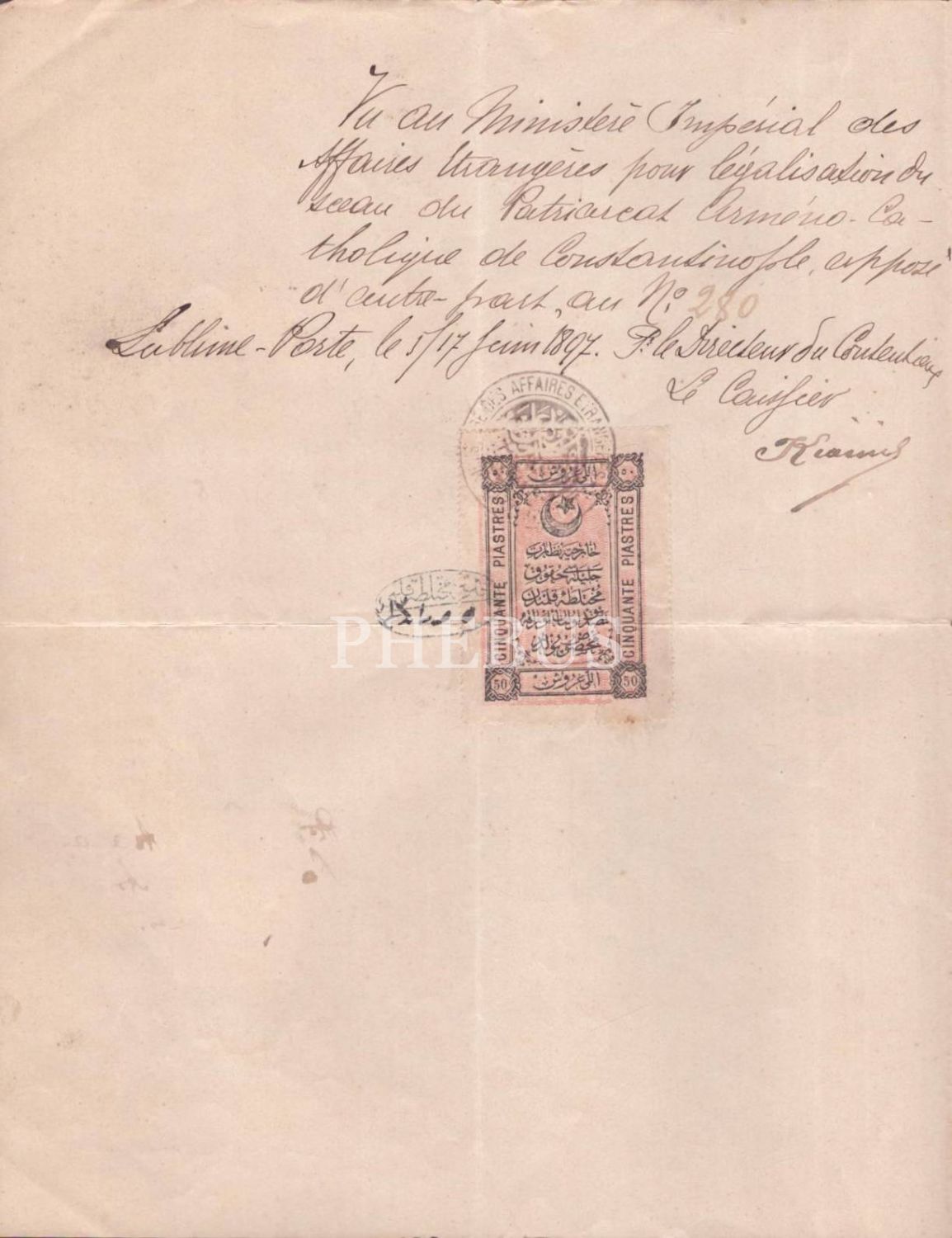 Ermeni Katolik Patrikhanesi "Patriarcat Armenien Catholique" antetli ve damgalı, 1897 tarihli Fransızca mektup, pullu ve postadan geçmiş, 4 sayfa, 27x21 cm...