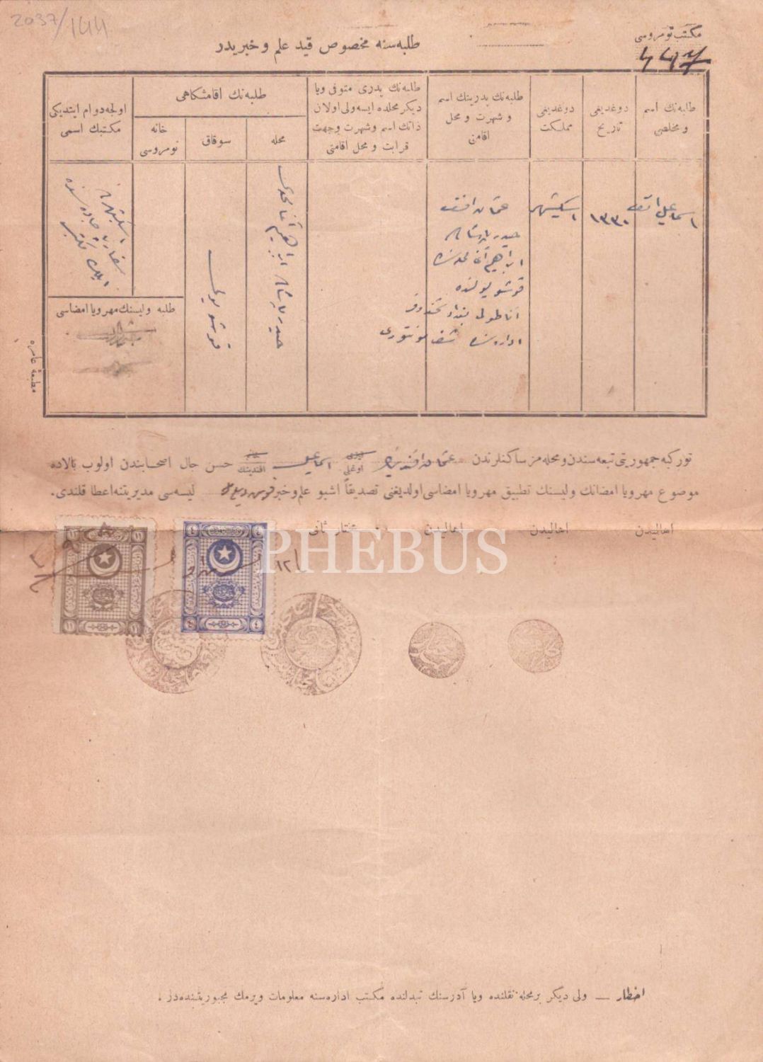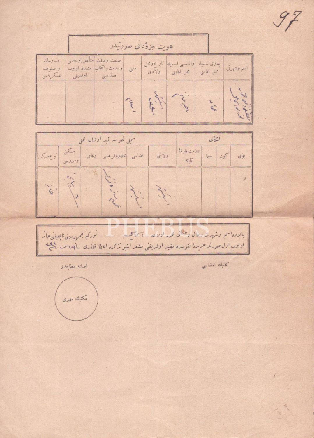 Eskişehir İlk Mektebi tarafından İsmail Ali Eşref Efendi adına düzenlenmiş Osmanlıca mektep kayıt ilmuhaberi, 1928, 29x21 cm...