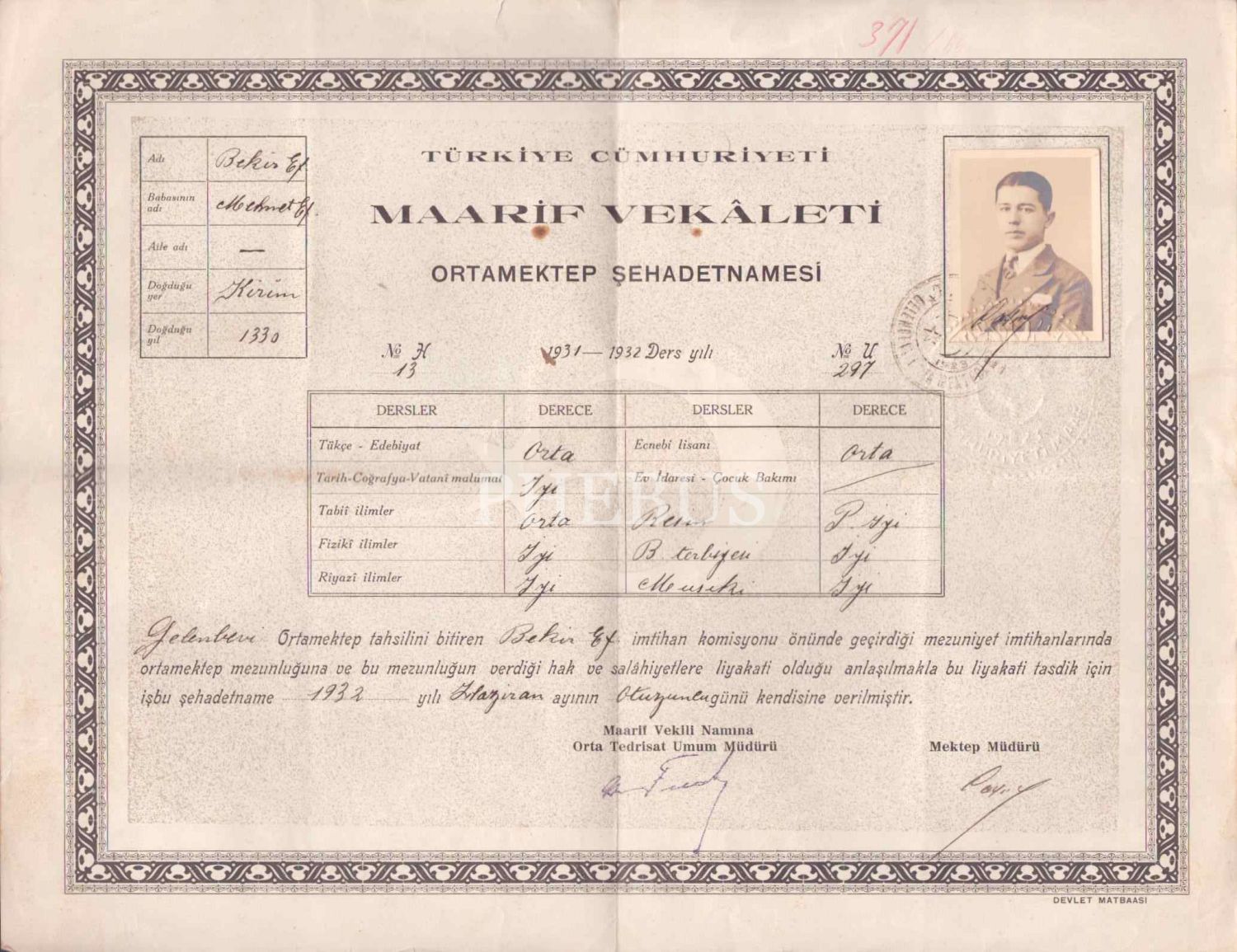 Gelenbevi Orta Mektebi tarafından Bekir Efendi´ye verilen fotoğraflı şehadetname, 1932, 35x27 cm...