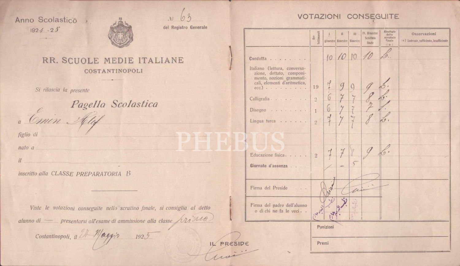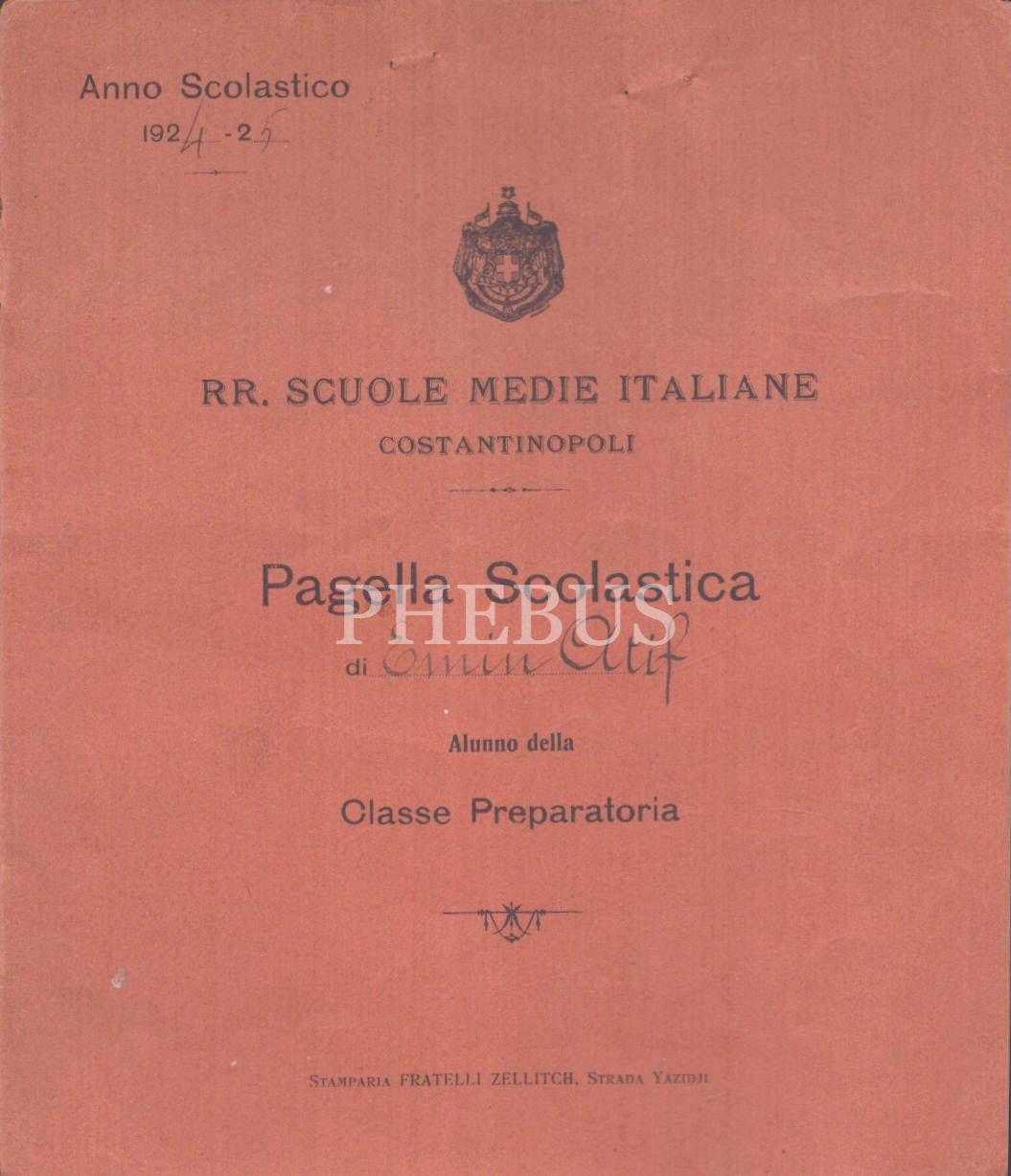 İstanbul R.R Scuole Medie Italiane tarafından Emin Atıf Bey´e verilen İtalyanca karne, 1925, 4 sayfa, 18x21 cm...
