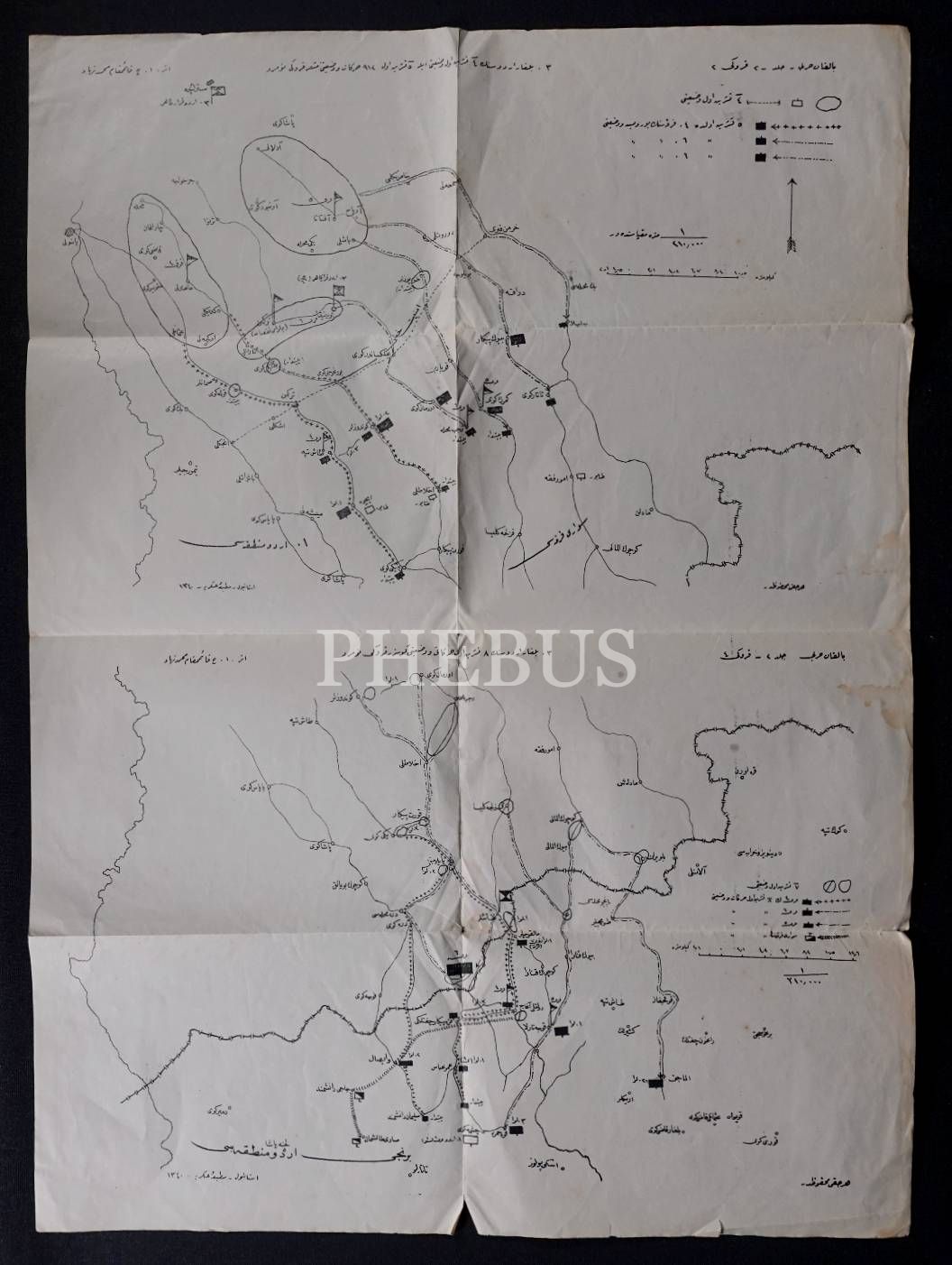 Balkan Harbi´nde 4-8 Teşrinievvel tarihlerinde Bulgar ordusunun harekatını ve vaziyetini gösteren Osmanlıca askeri harita, İstanbul Matbaa-i Askeriye 1340, 42x58 cm...
